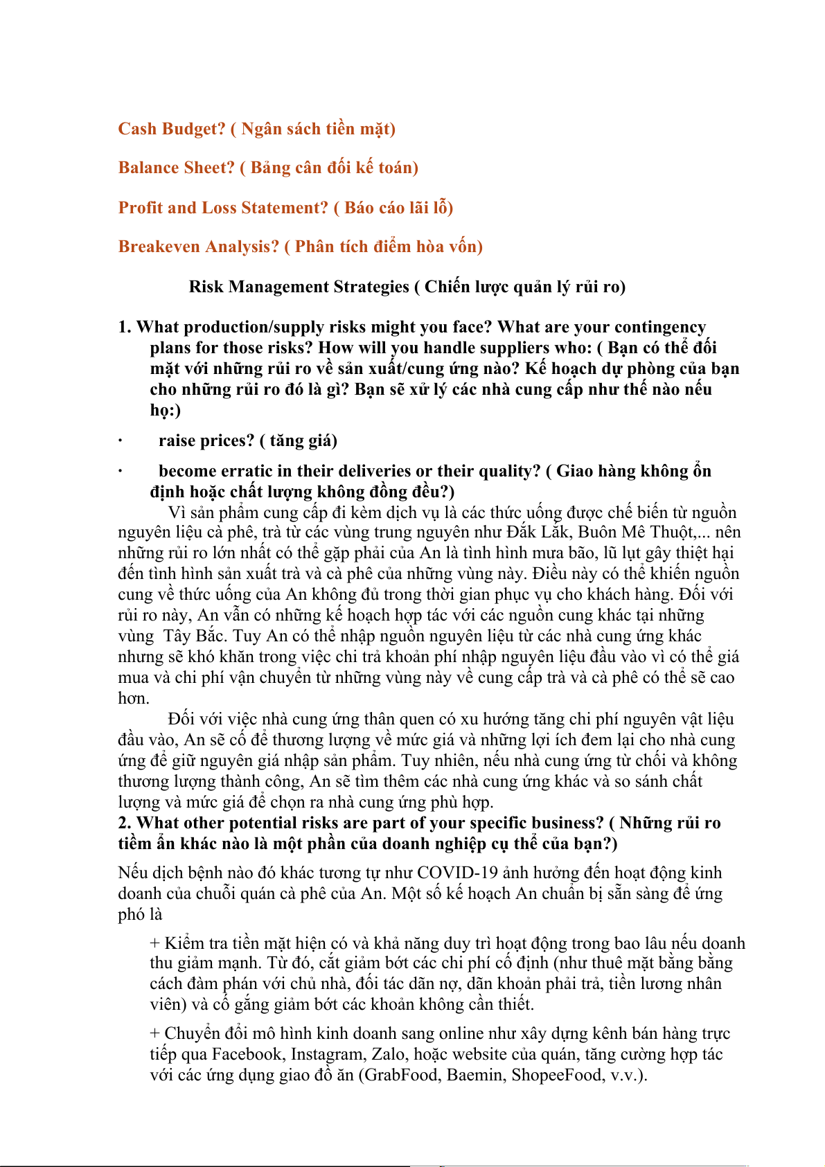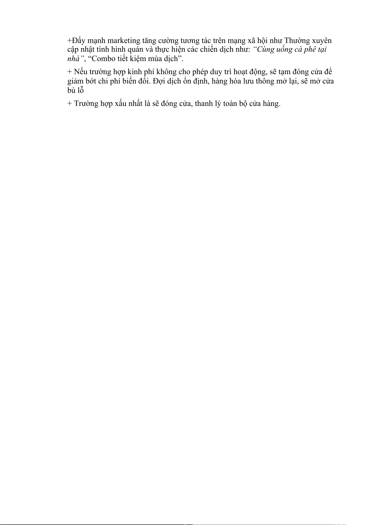 doanh của chuỗi quán cà phê của An. Một số kế hoạch An chuẩn bị sẵn sàng để ứng phó là