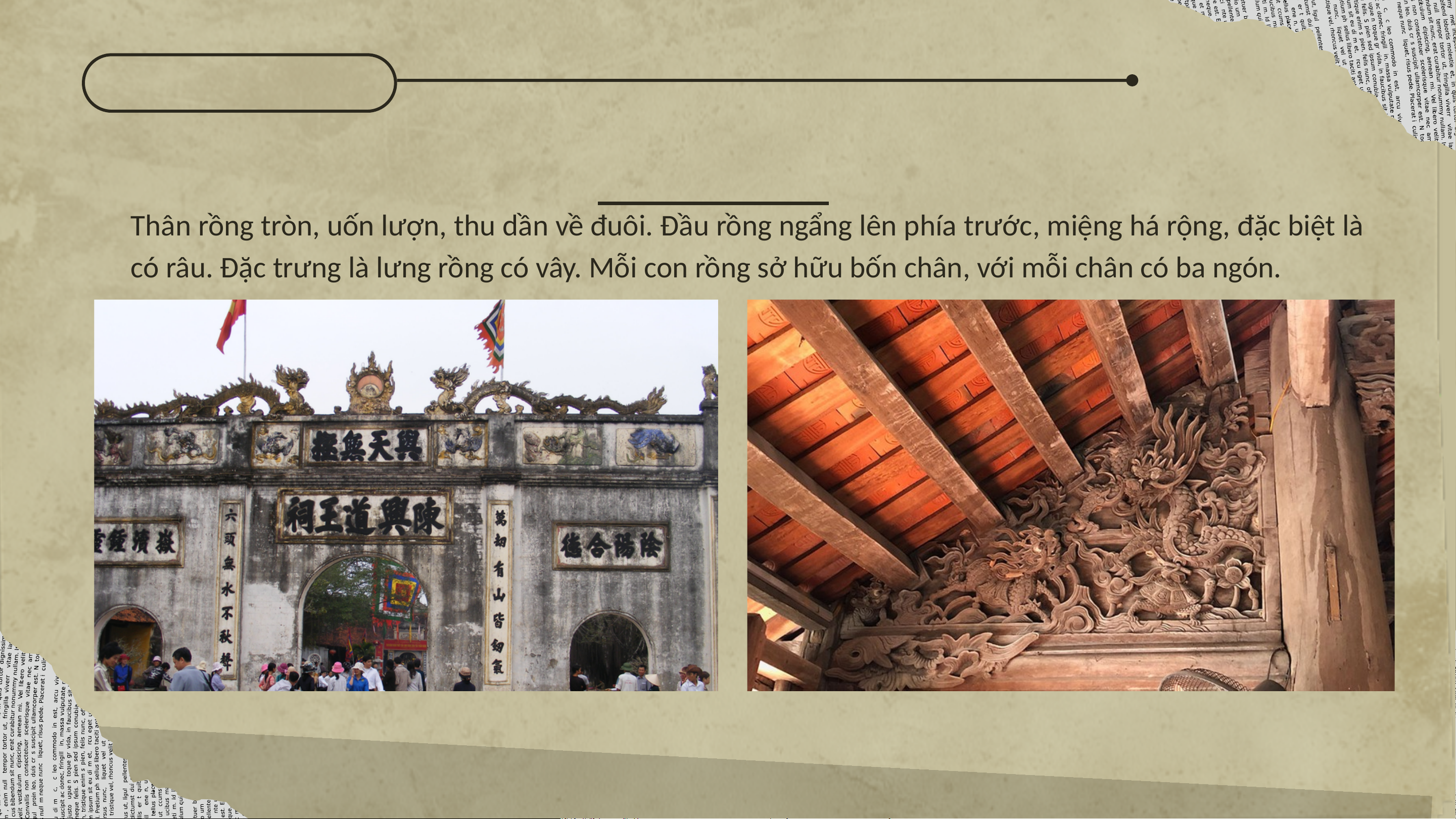 Râu Rồng mềm mại như sóng nước, uốn lượn theo gió. THỜI LÝ 1. ĐẶC TRƯNG Thân và chân rồng: Da trơn và không có Có 4 chân, có loại 3 vảy móng hoặc 5 móng. Dọc sống lưng có một Móng vuốt nhỏ nhắn và