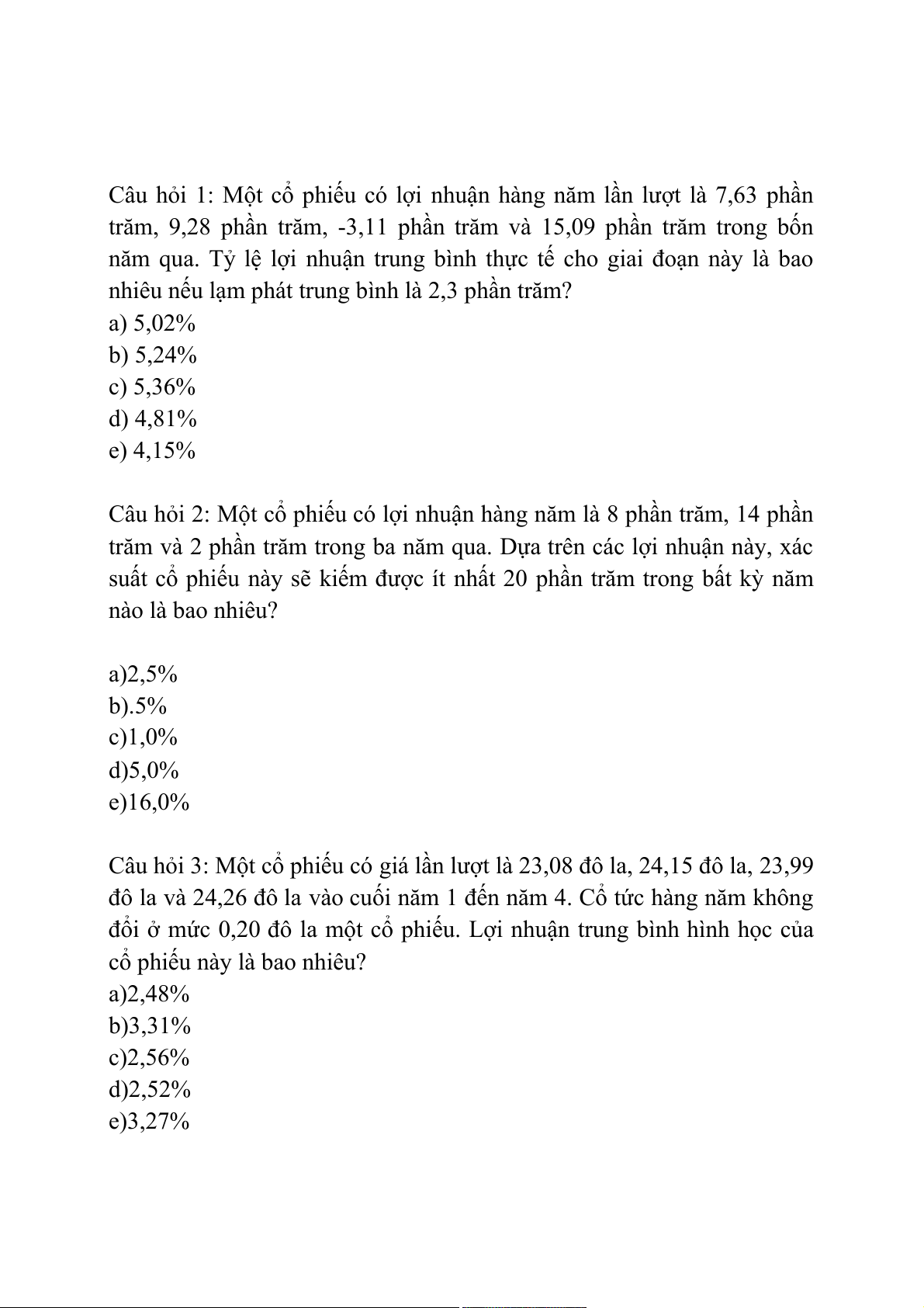 Câu hỏi 1: Một cổ phiếu có lợi nhuận hàng năm lần lượt là 7,63 phần