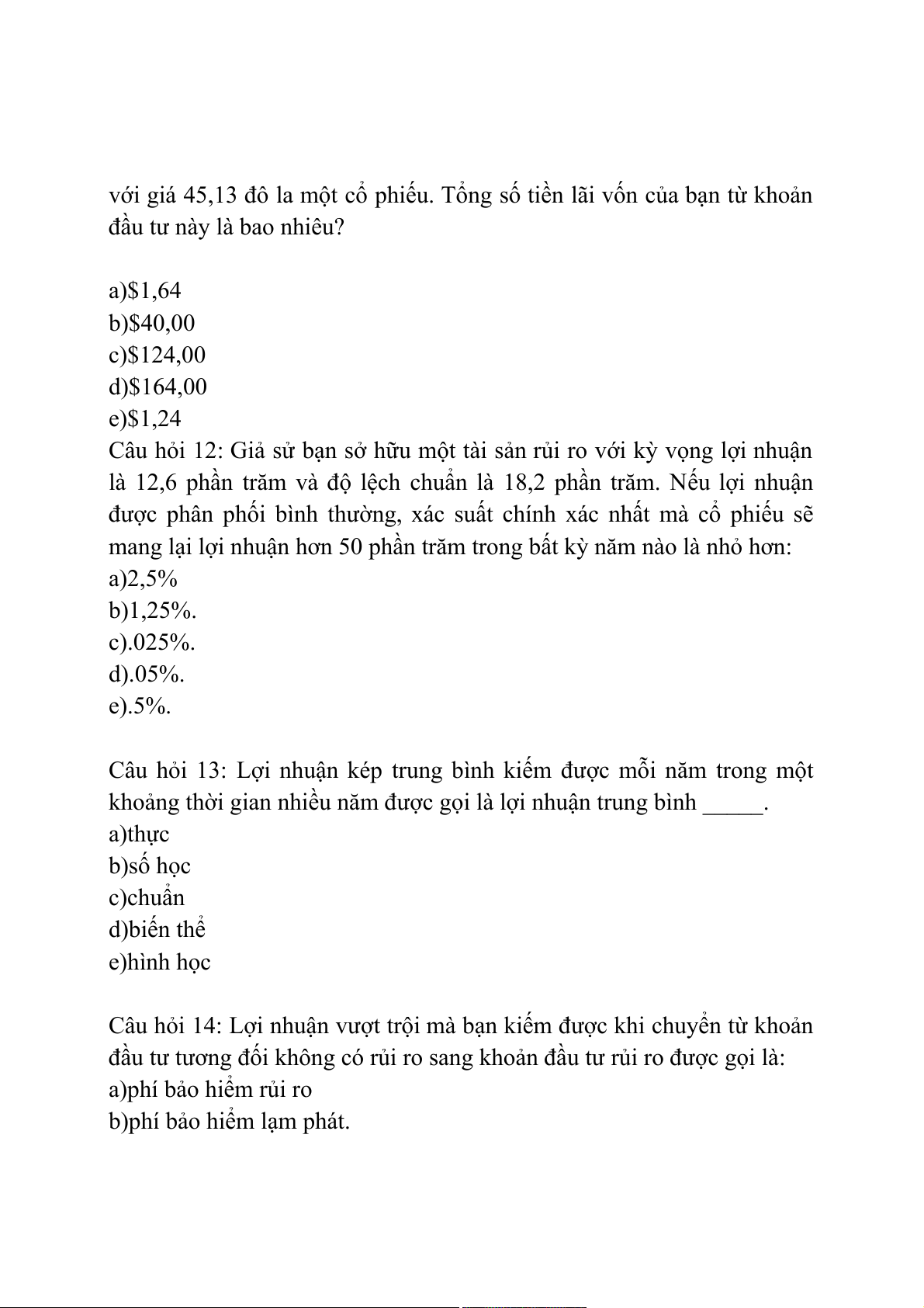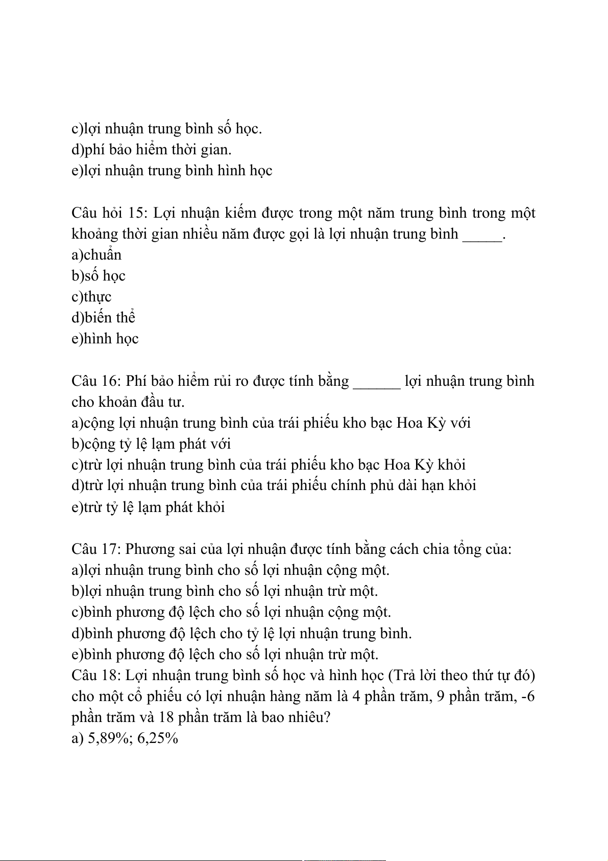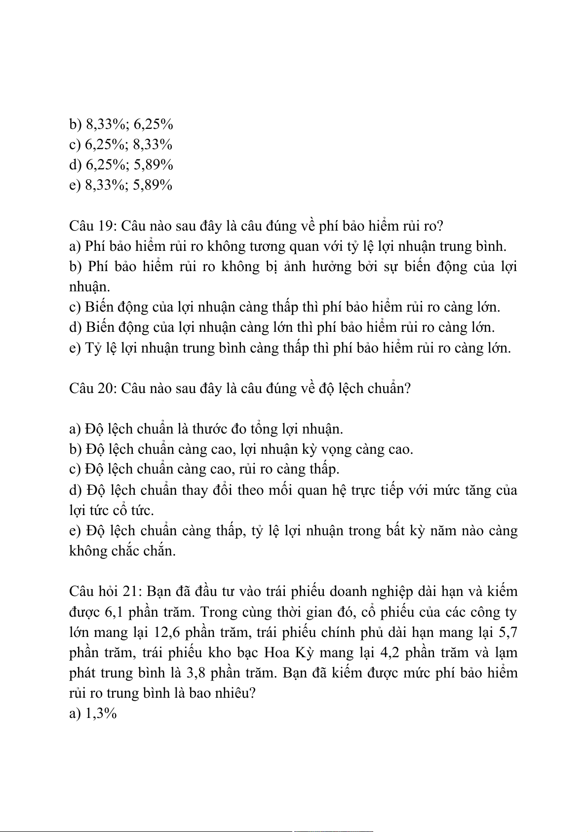Câu 16: Phí bảo hiểm rủi ro được tính bằng ______ lợi nhuận trung bình cho khoản đầu tư.