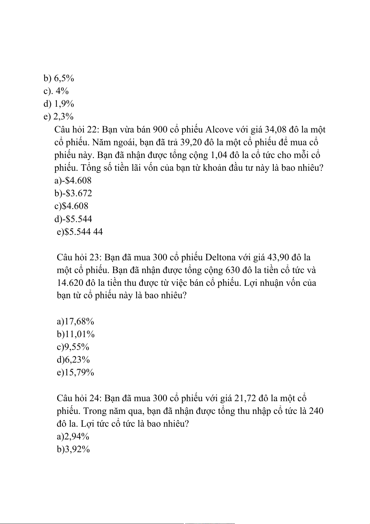 đô la. Lợi tức cổ tức là bao nhiêu? a)2,94% b)3,92% c)3,22% d)3,68% e)2,80%