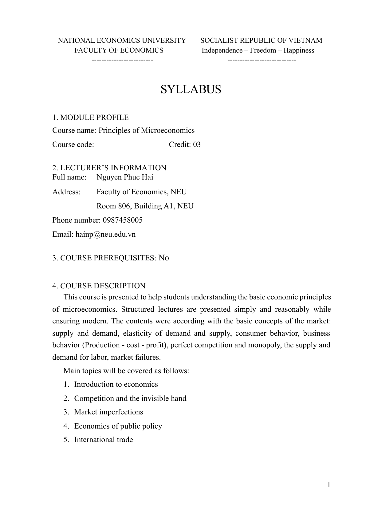 Course name: Principles of Microeconomics Course code: Credit: 03 2. LECTURER’S INFORMATION Full name: Nguyen Phuc Hai Address: Faculty of Economics, NEU Room 806, Building A1, NEU Phone number: 0987458005 Email: hainp@neu.edu.vn 3. COURSE PREREQUISITES: No 4. COURSE DESCRIPTION