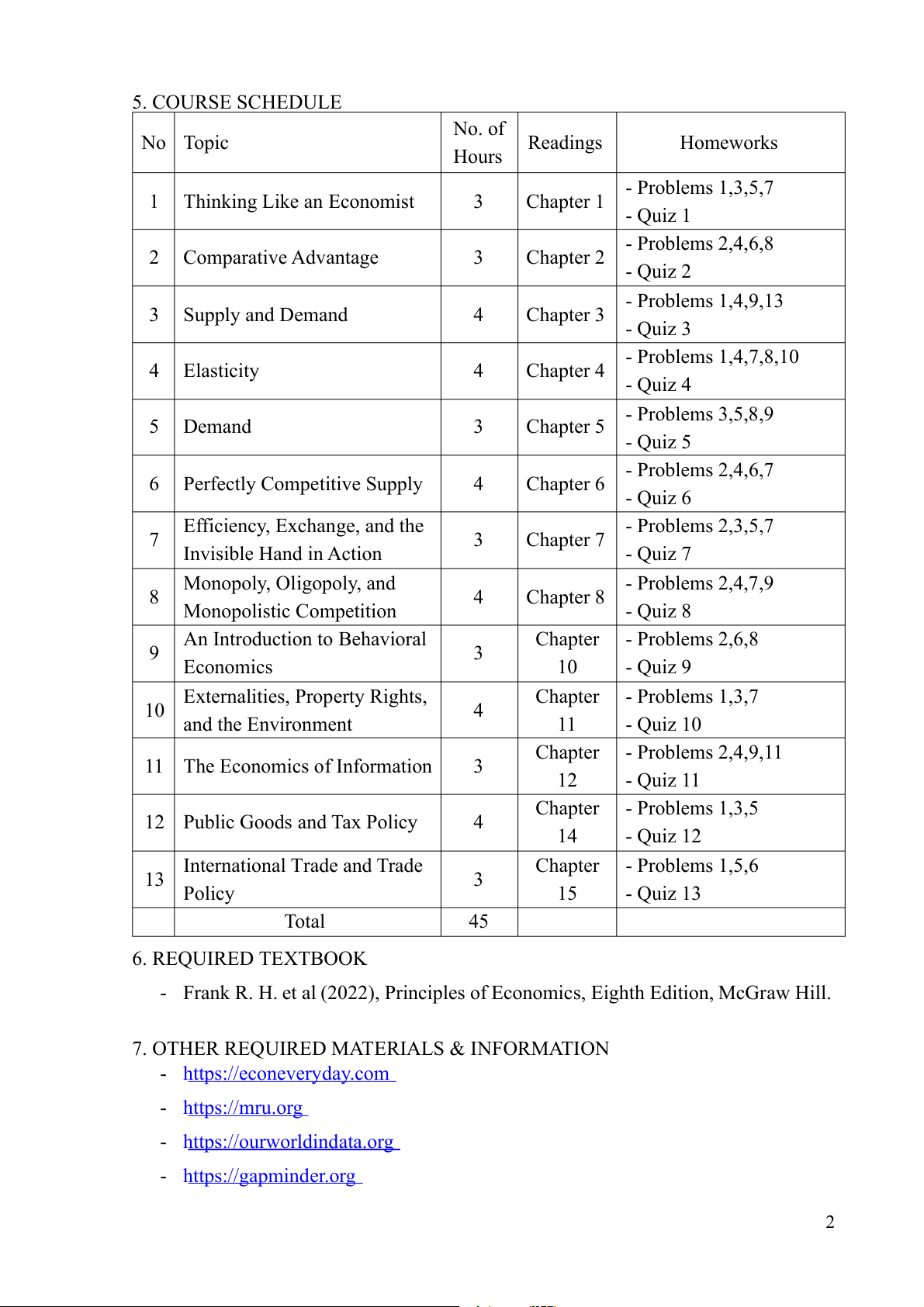 2. Competition and the invisible hand 3. Market imperfections 4. Economics of public policy 5. International trade 1 5. COURSE SCHEDULE No. of No Topic Readings Homeworks Hours - Problems 1,3,5,7 1 Thinking Like an Economist 3 Chapter 1 - Quiz 1 - Problems 2,4,6,8 2 Comparative Advantage 3 Chapter 2 - Quiz 2 - Problems 1,4,9,13 3 Supply and Demand 4 Chapter 3 - Quiz 3 - Problems 1,4,7,8,10 4 Elasticity 4 Chapter 4 - Quiz 4 - Problems 3,5,8,9 5 Demand 3 Chapter 5 - Quiz 5 - Problems 2,4,6,7