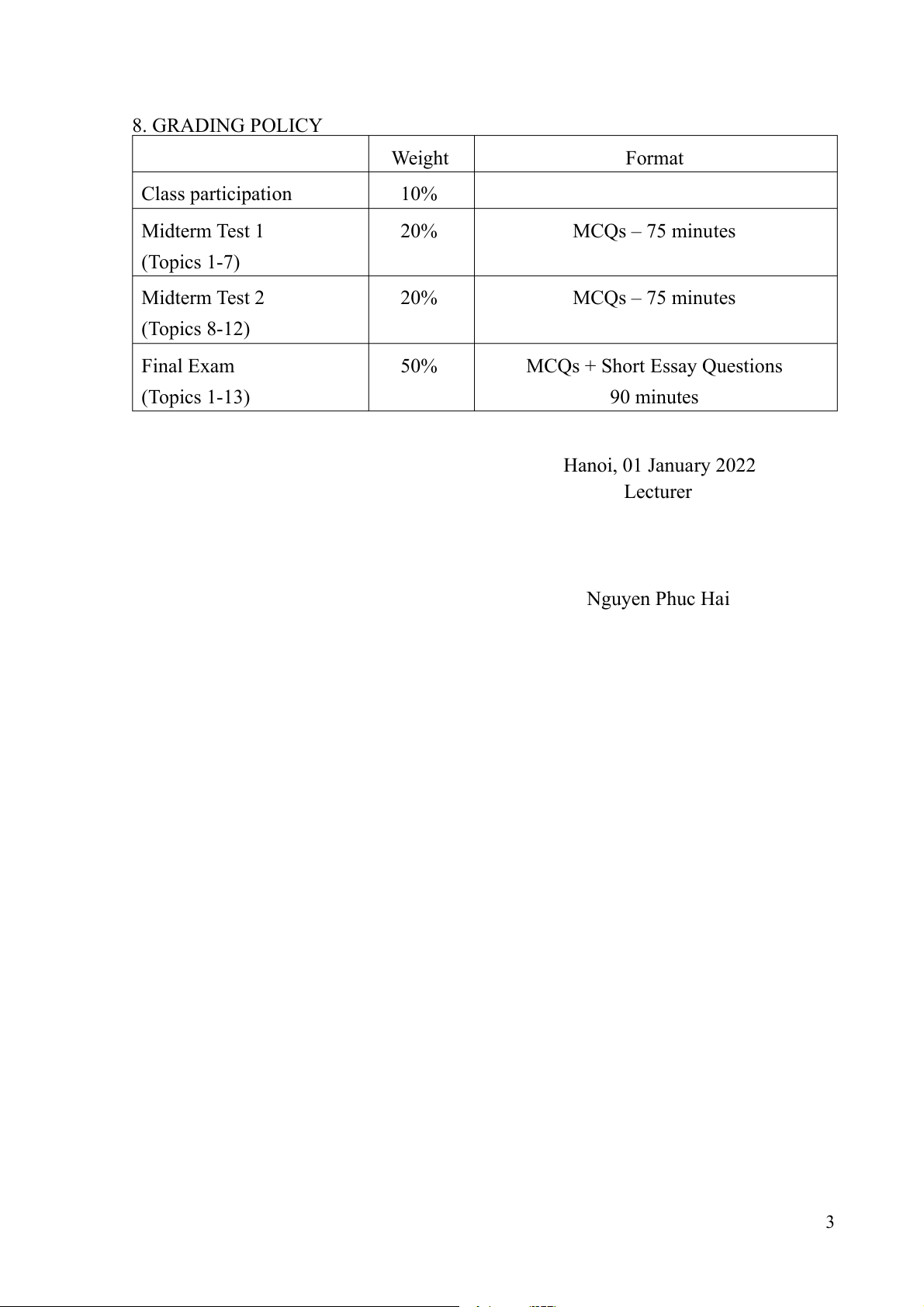 7. OTHER REQUIRED MATERIALS & INFORMATION - https://econeveryday.com - https://mru.org - https://ourworldindata.org - https://gapminder.org 2 8. GRADING POLICY Weight Format Class participation 10% Midterm Test 1 20% MCQs – 75 minutes (Topics 1-7) Midterm Test 2 20% MCQs – 75 minutes (Topics 8-12) Final Exam 50% MCQs + Short Essay Questions (Topics 1-13) 90 minutes Hanoi, 01 January 2022 Lecturer Nguyen Phuc Hai 3