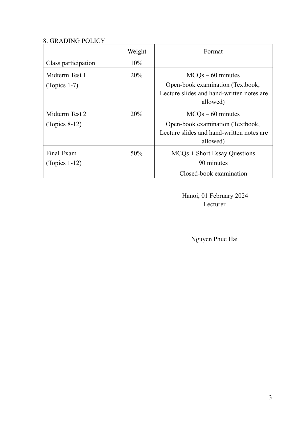 Lecture slides and hand-written notes are allowed) Final Exam 50% MCQs + Short Essay Questions (Topics 1-12) 90 minutes Closed-book examination Hanoi, 01 February 2024 Lecturer Nguyen Phuc Hai 3