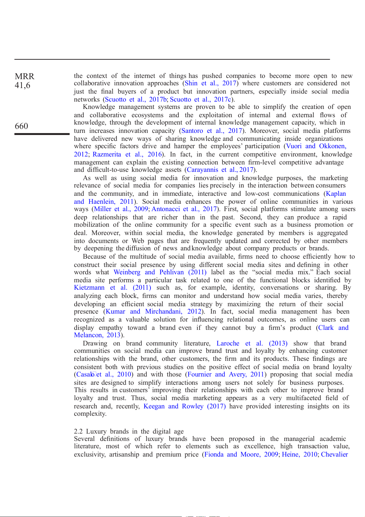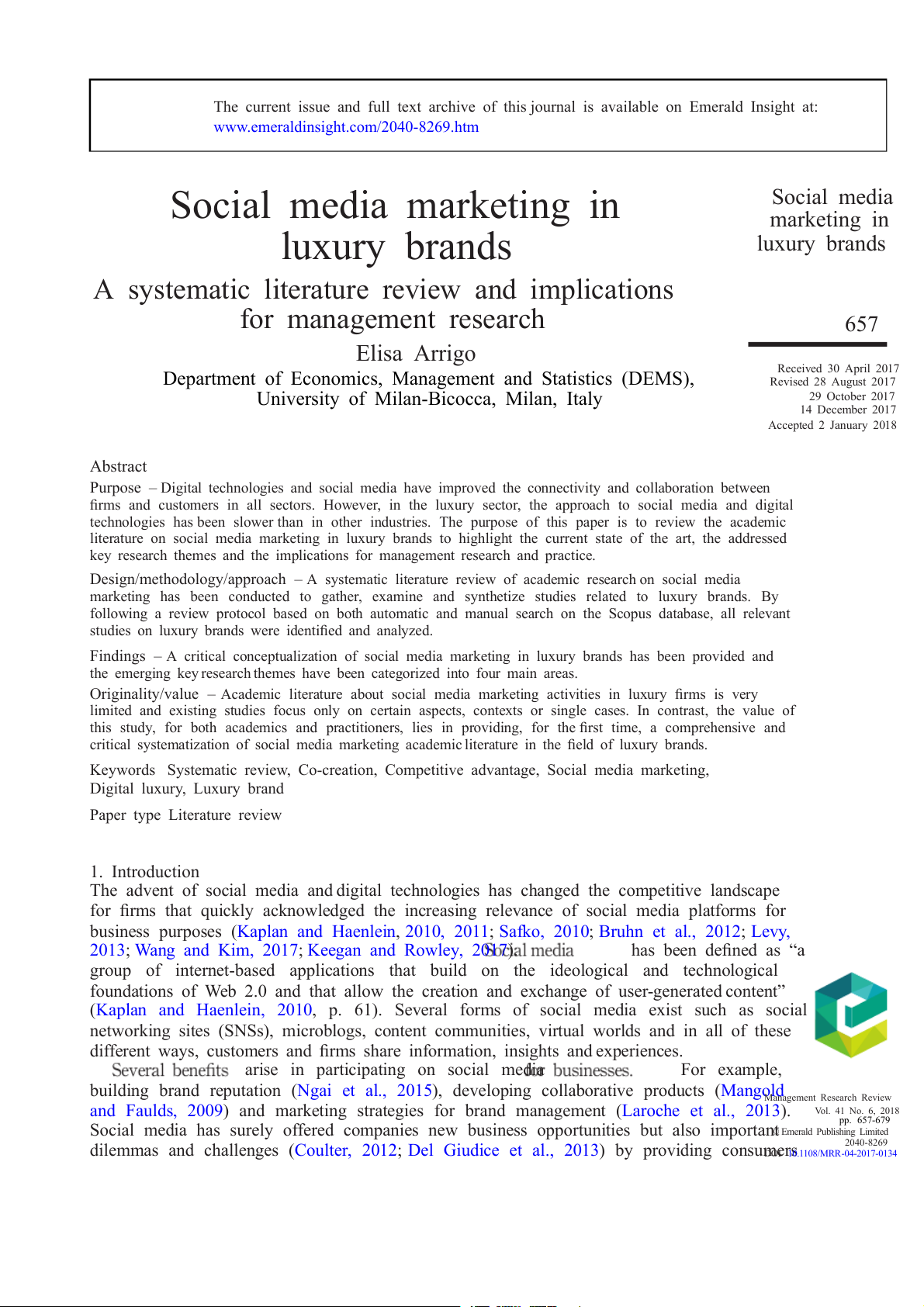 Keywords Systematic review, Co-creation, Competitive advantage, Social media marketing, Digital luxury, Luxury brand Paper type Literature review 1. Introduction
