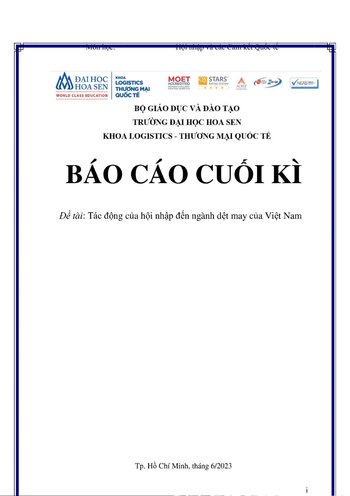 Hội nhập và các Cam kết Quốc tế      lOMoAR cPSD| 47206071     Thời gian thực hiện:  1/6/2023-28/6/2023    Giảng viên hướng dẫn:  Ths. Trần Ngọc Quỳnh    Lớp:  1930    Nhóm:  6    Sinh viên thực hiện:  Tôn Trần Nghệ Gia  22122607      Nguyễn Khánh Ly  22117188      Nguyễn Như Minh  22103152      Lê Thảo Nguyên  22110599      Phạm Quỳnh Trúc Nguyên  22117143      Đoàn Hoàng Nhi  22100614              ii    lOMoAR cPSD| 47206071     BÁO CÁO CUỐI KÌ