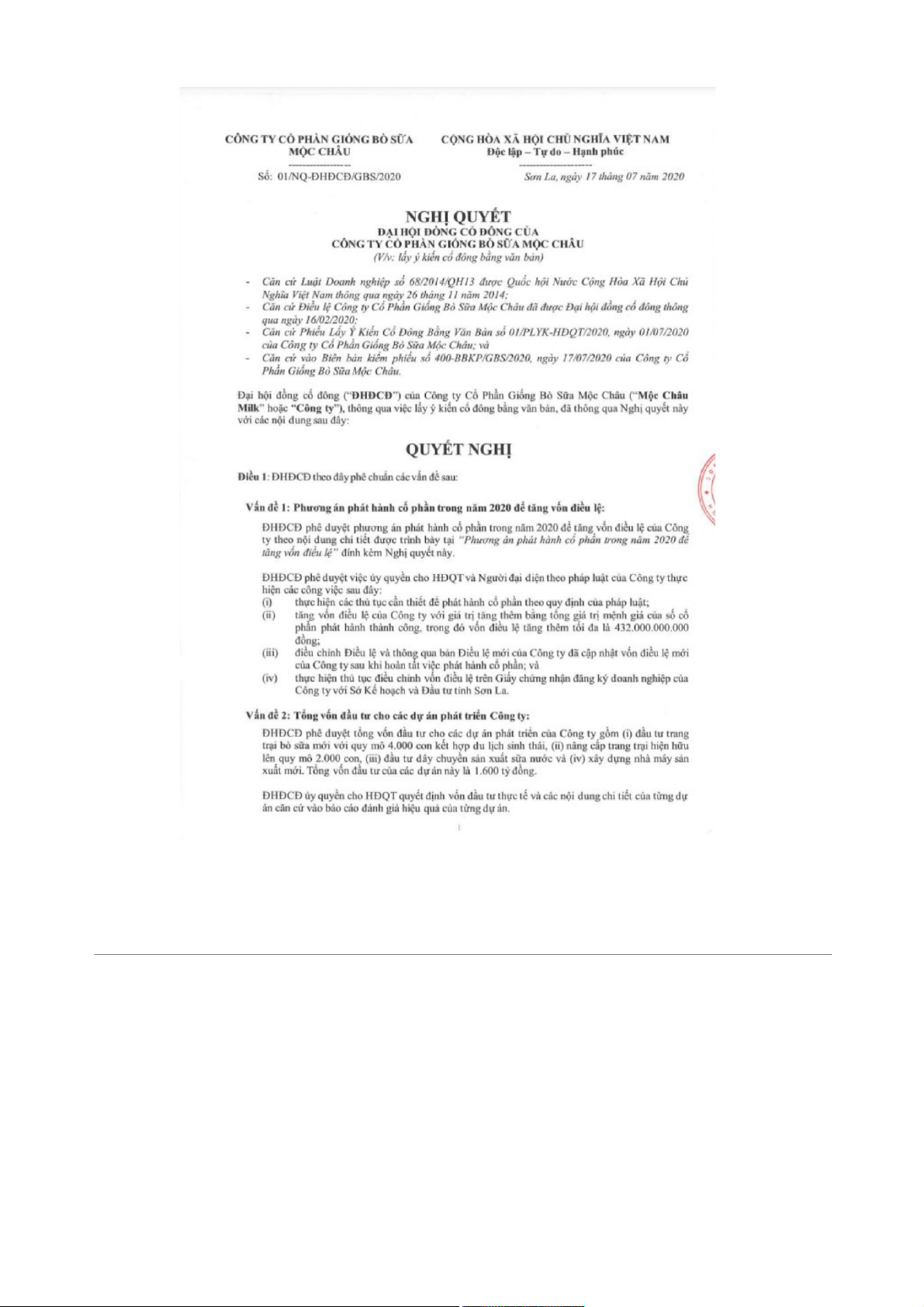 Cụ thể, vào ngày 17/07/2020, Đại hội đồng cổ đông của Mộc Châu Milk đã thông qua việc phát