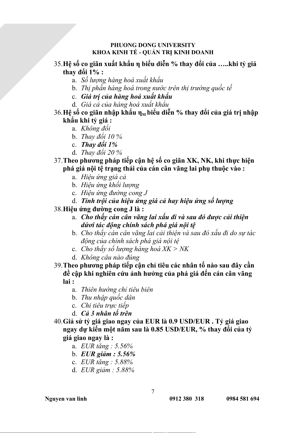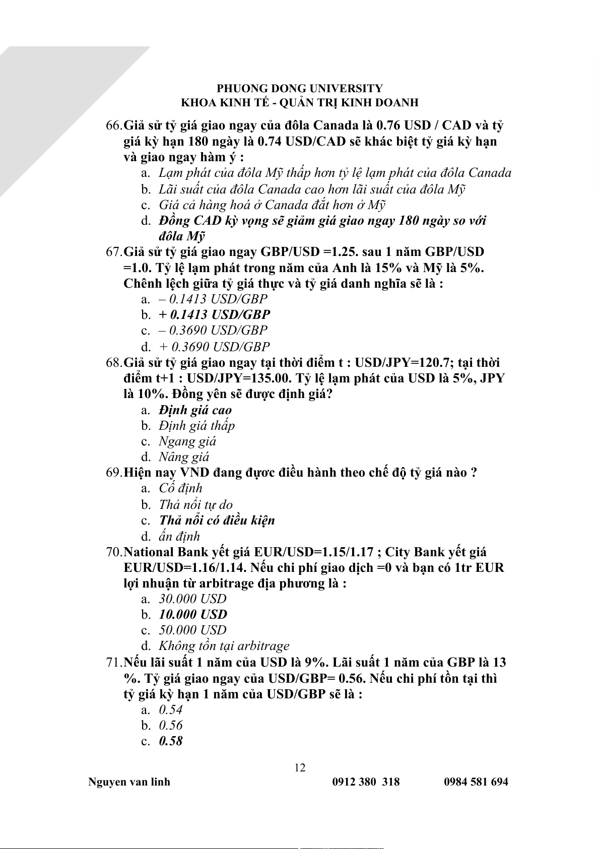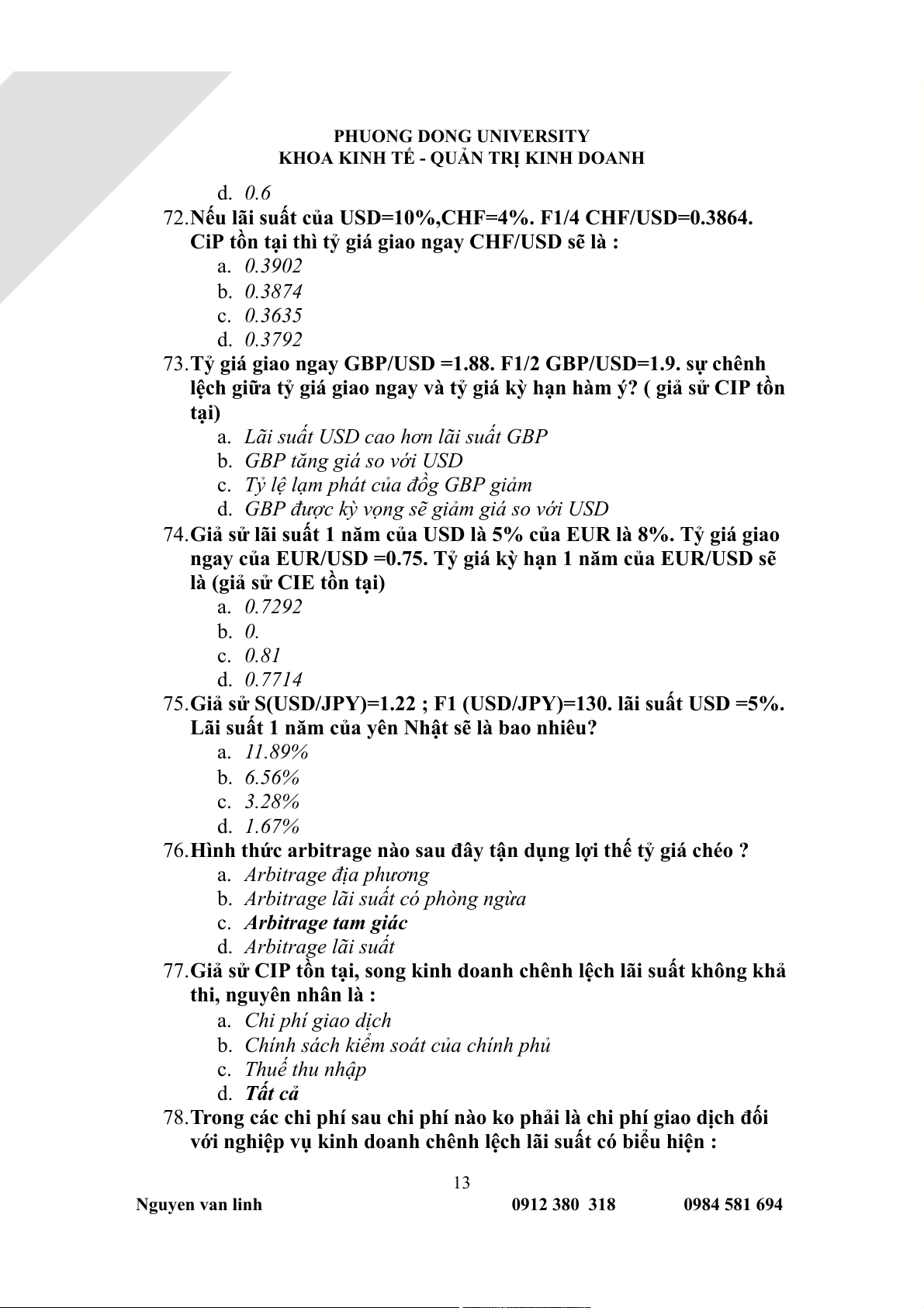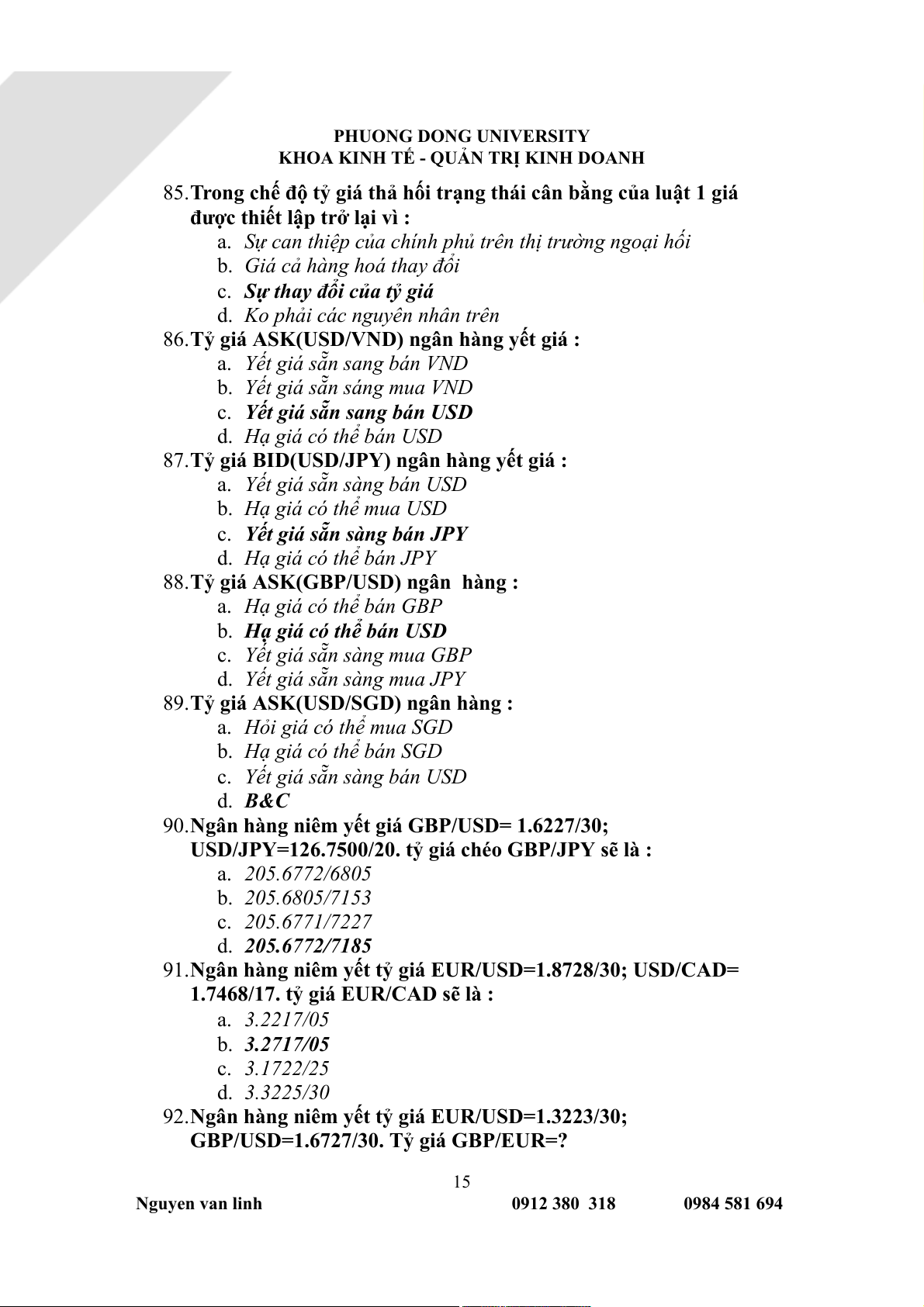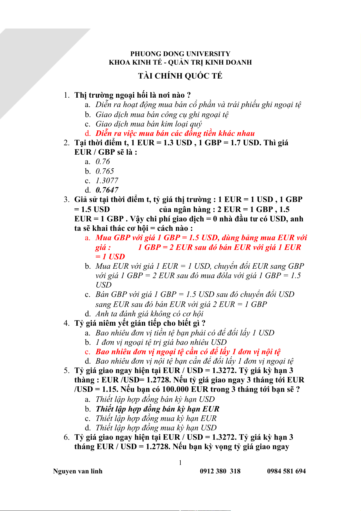 2. Tại thời điểm t, 1 EUR = 1.3 USD , 1 GBP = 1.7 USD. Thì giá EUR / GBP sẽ là : a. 0.76 b. 0.765 c. 1.3077 d. 0.7647