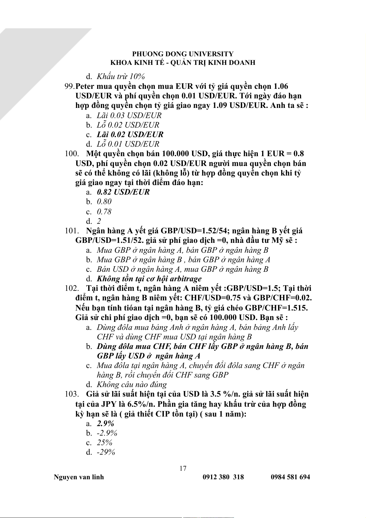 hợp đồng quyền chọn tỷ giá giao ngay 1.09 USD/EUR. Anh ta sẽ : a. Lãi 0.03 USD/EUR b. Lỗ 0.02 USD/EUR c. Lãi 0.02 USD/EUR d. Lỗ 0.01 USD/EUR