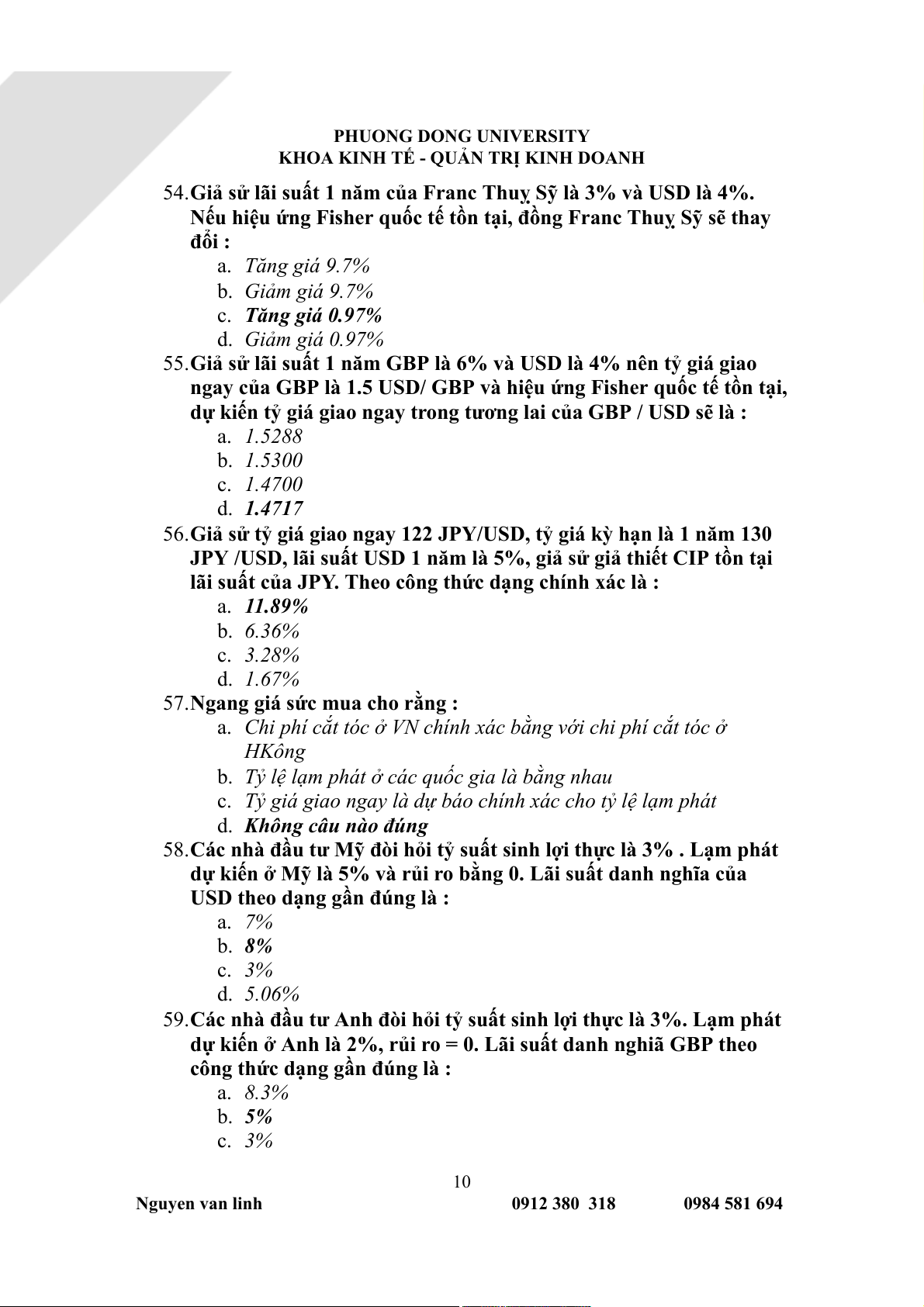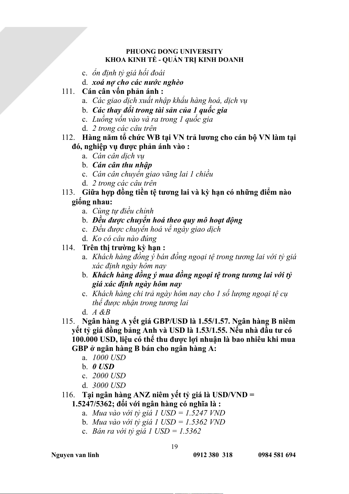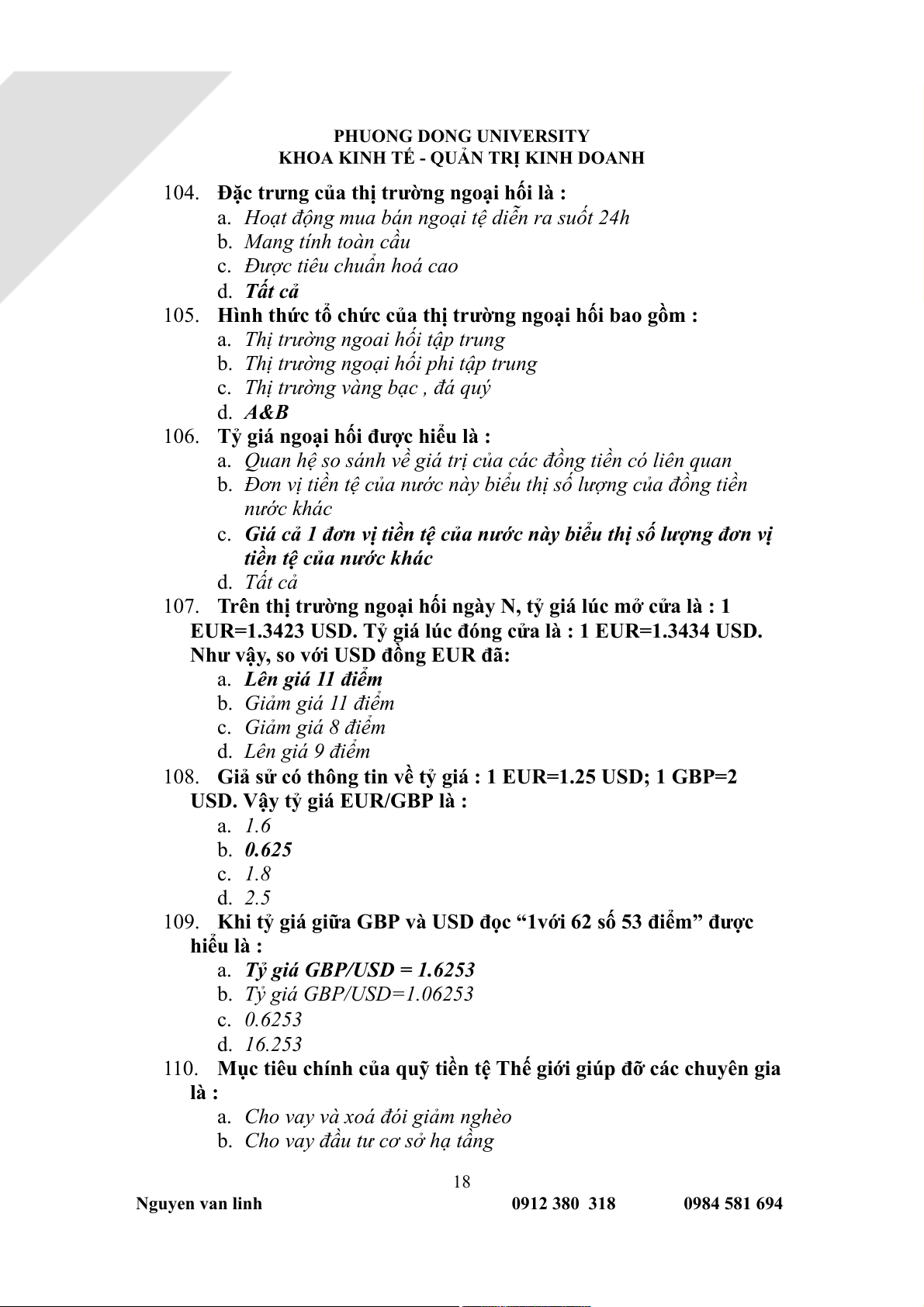 109. Khi tỷ giá giữa GBP và USD đọc “1với 62 số 53 điểm” được hiểu là : a. Tỷ giá GBP/USD = 1.6253 b. Tỷ giá GBP/USD=1.06253 c. 0.6253 d. 16.253