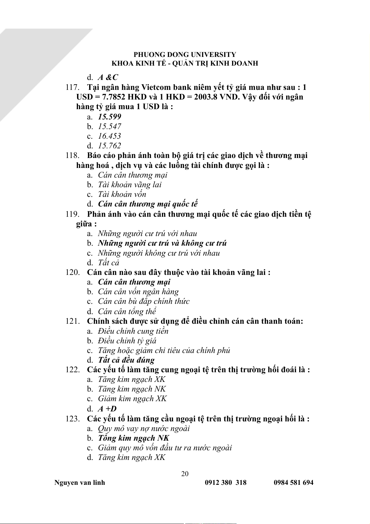 120. Cán cân nào sau đây thuộc vào tài khoản vãng lai : a. Cán cân thương mại b. Cán cân vốn ngân hàng