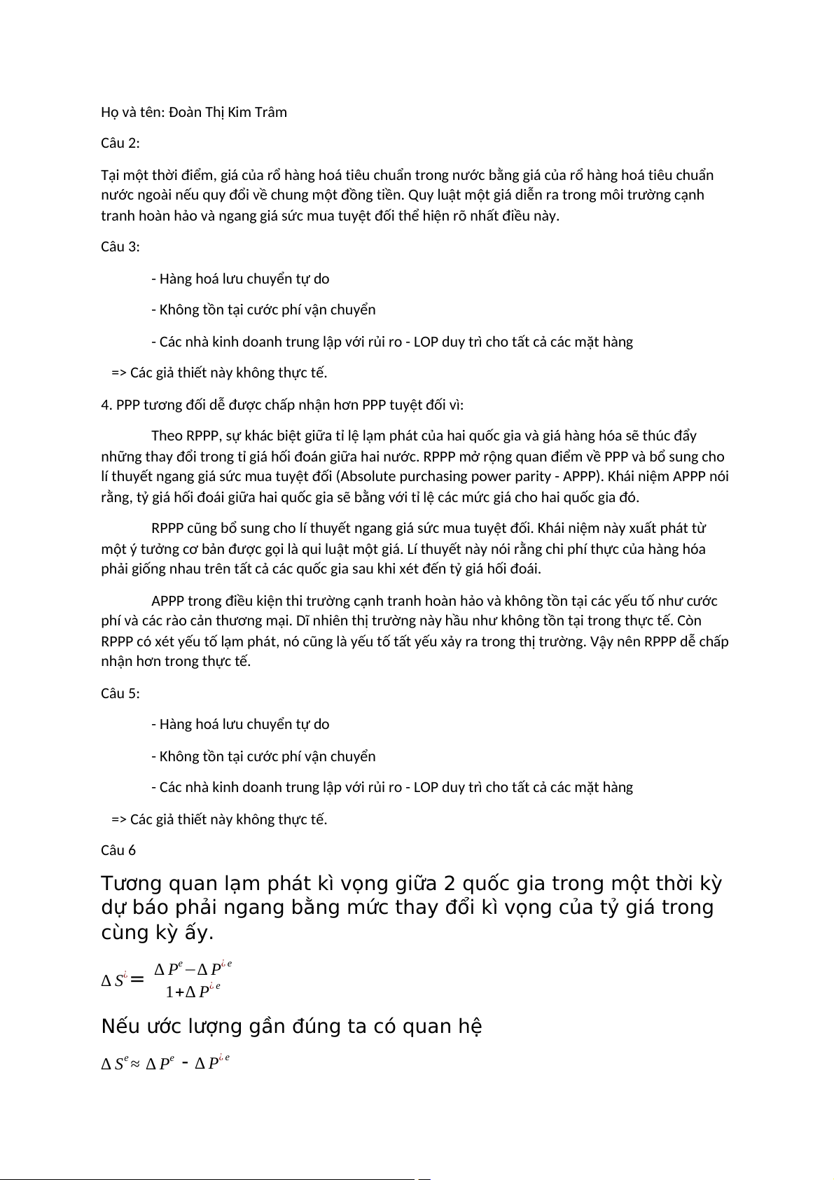 Vì vậy, mức thay đổi tỷ giá kỳ vọng bằng mức chệnh lệch lạm phát kỳ vọng. Câu 7
