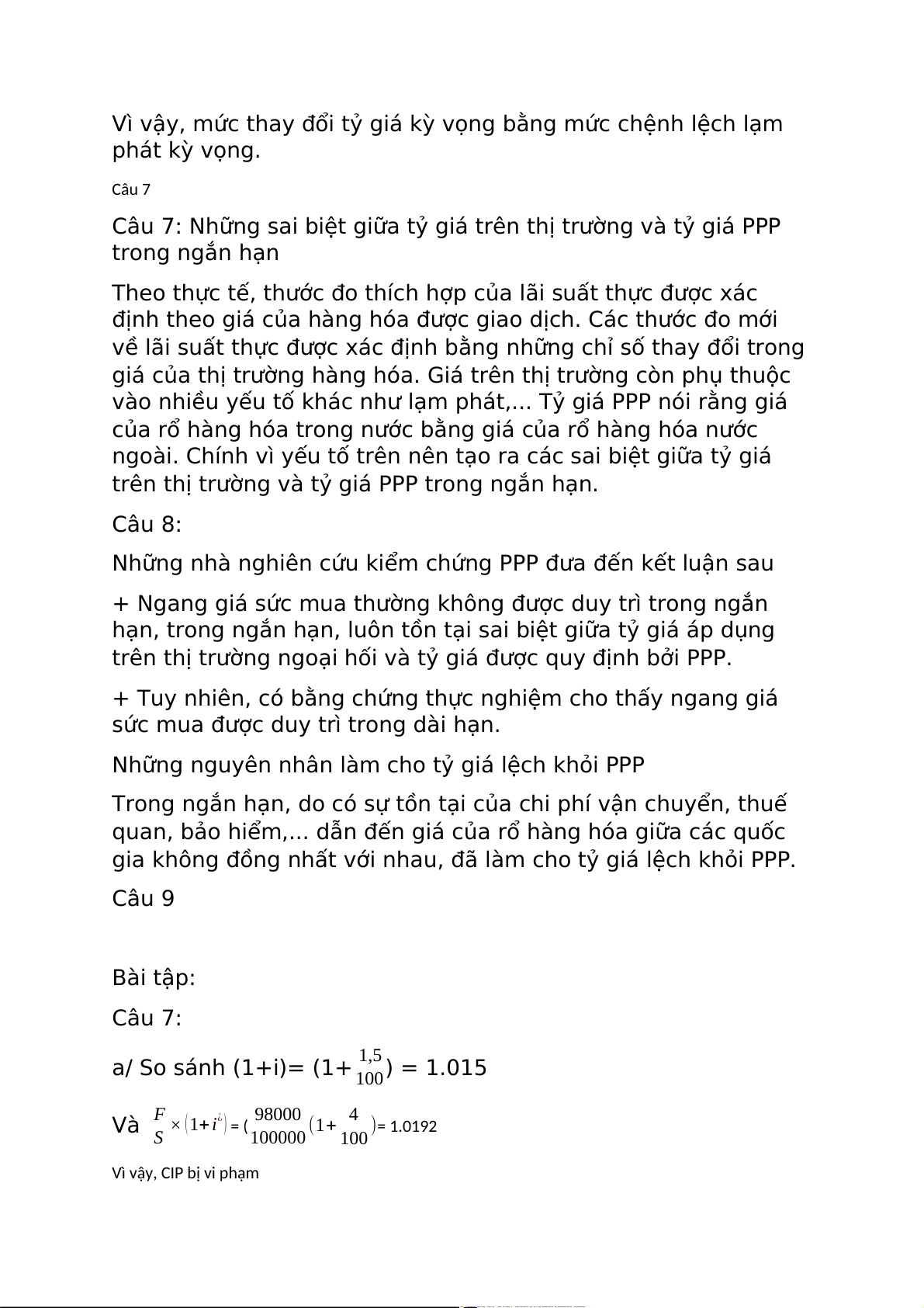 gia không đồng nhất với nhau, đã làm cho tỷ giá lệch khỏi PPP. Câu 9 Bài tập: Câu 7: