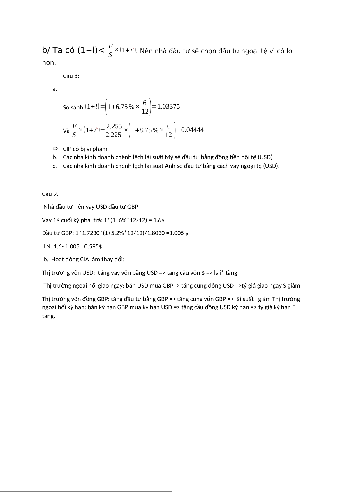 c. Các nhà kinh doanh chênh lệch lãi suất Anh sẽ đầu tư bằng cách vay ngoại tệ (USD). Câu 9.