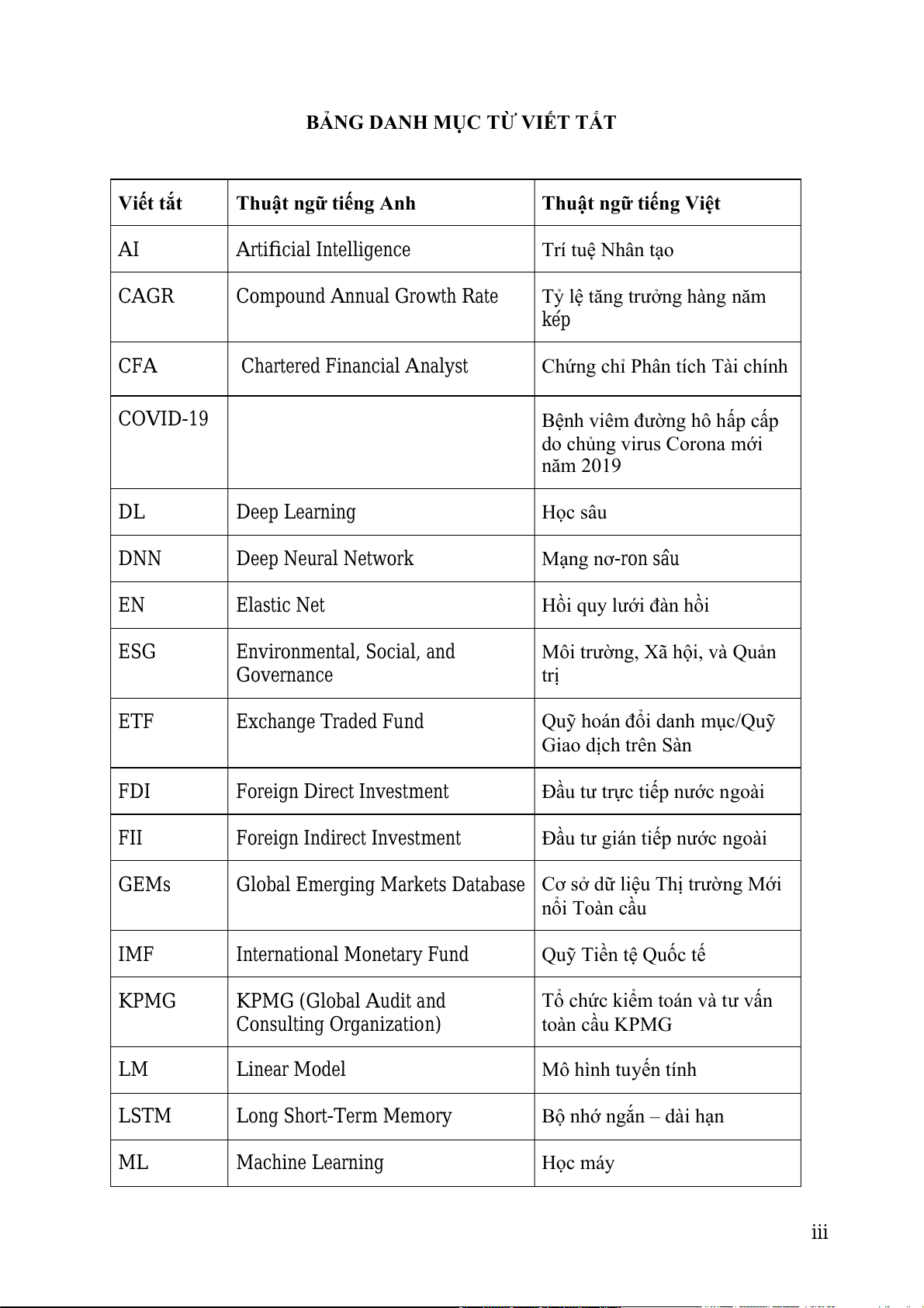 Bệnh viêm đường hô hấp cấp do chủng virus Corona mới năm 2019 DL Deep Learning Học sâu DNN Deep Neural Network Mạng nơ-ron sâu EN Elastic Net Hồi quy lưới đàn hồi ESG Environmental, Social, and