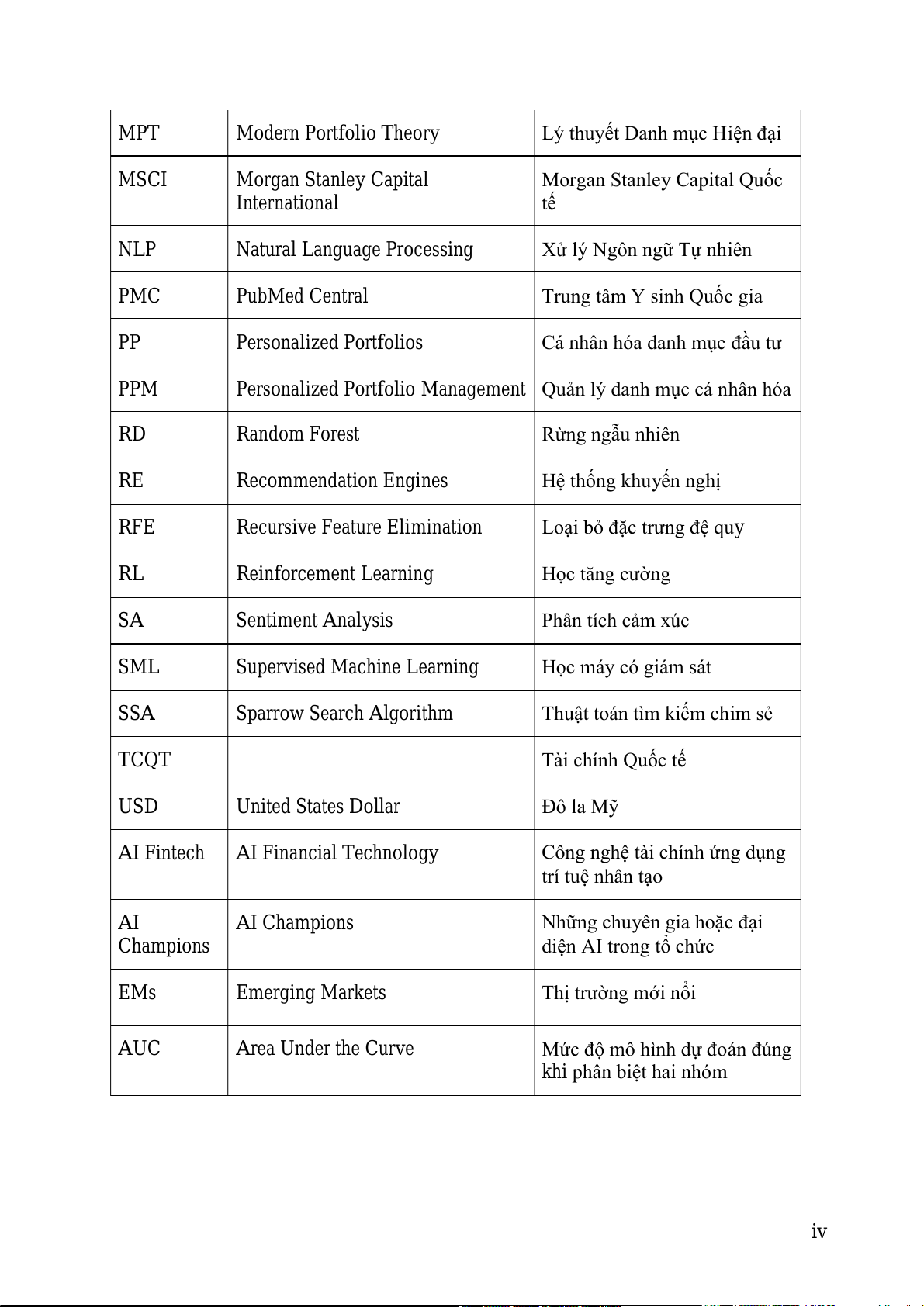 Personalized Portfolio Management Quản lý danh mục cá nhân hóa RD Random Forest Rừng ngẫu nhiên RE Recommendation Engines Hệ thống khuyến nghị RFE Recursive Feature Elimination