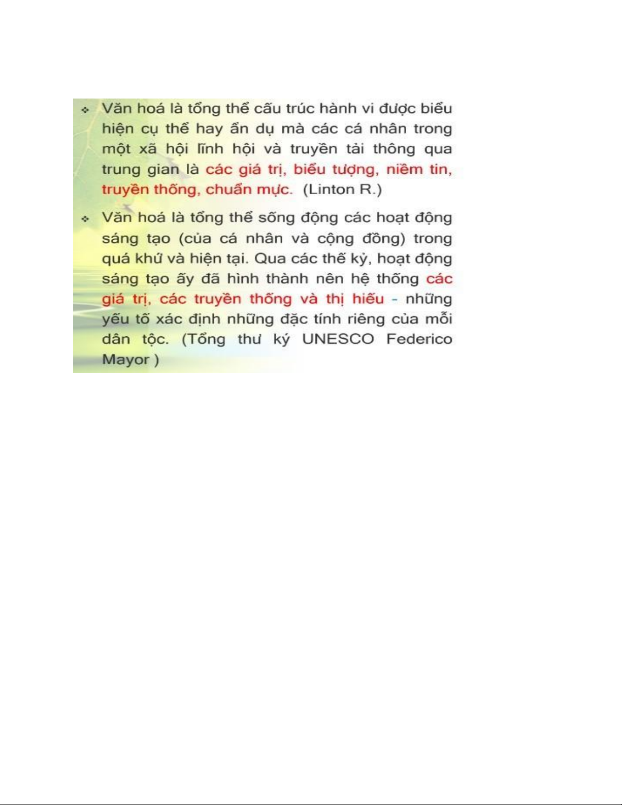 Văn hóa – xã hội: nền vhoa, nhánh vhoa, gtri vhoa truyền thống và phái