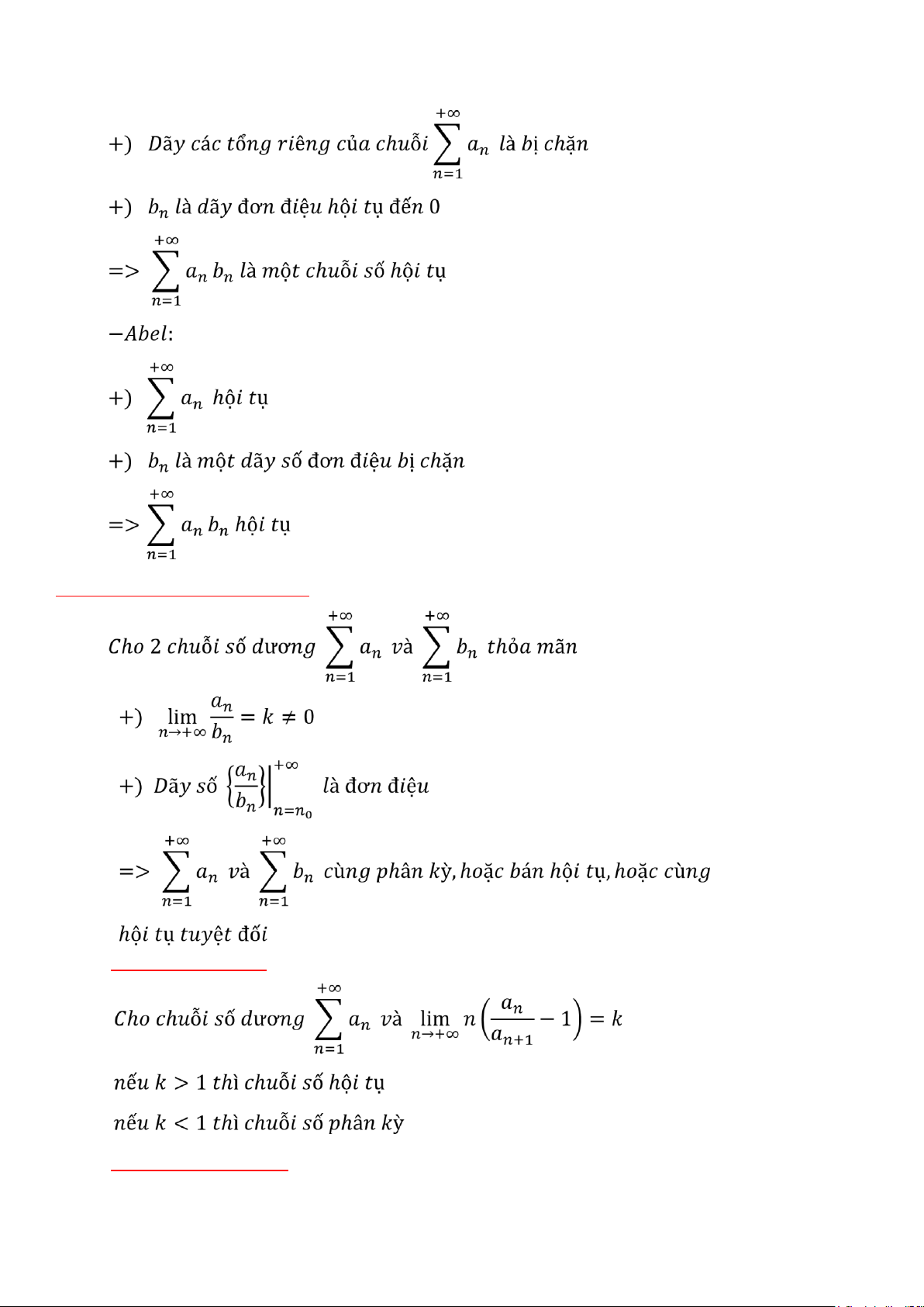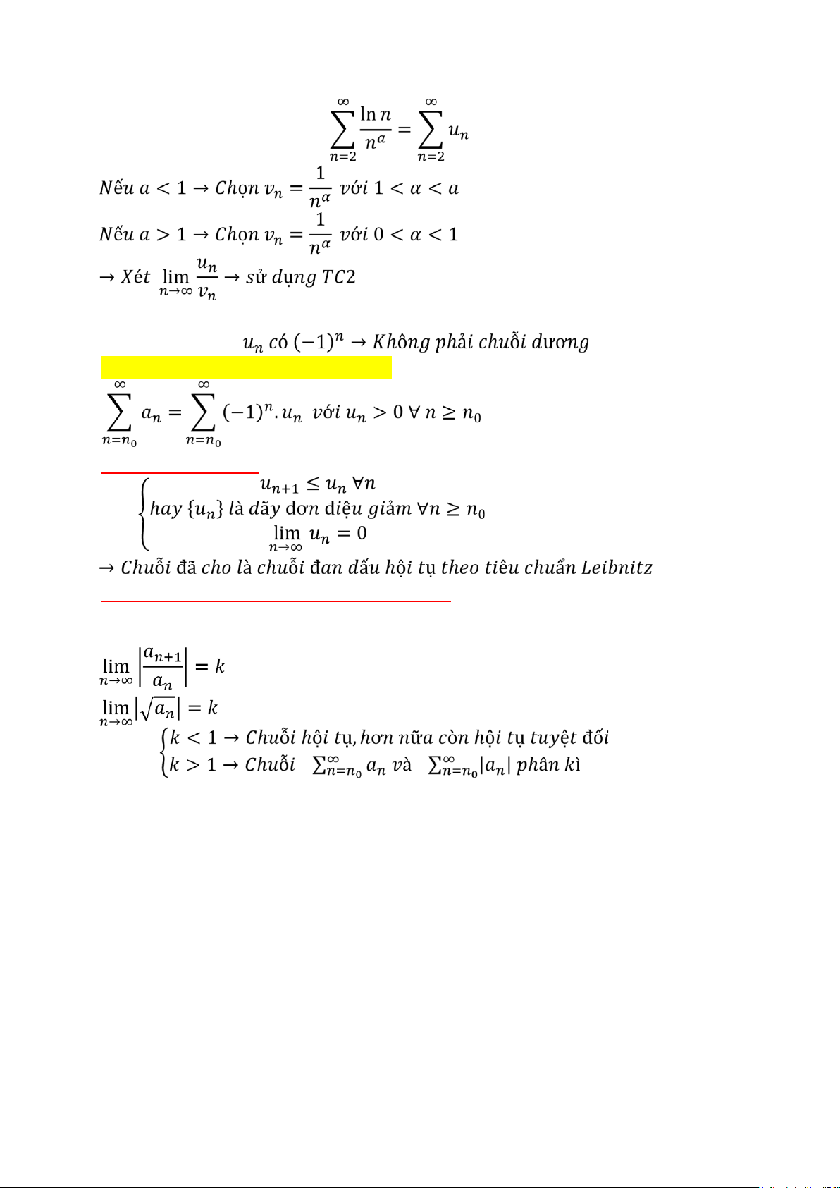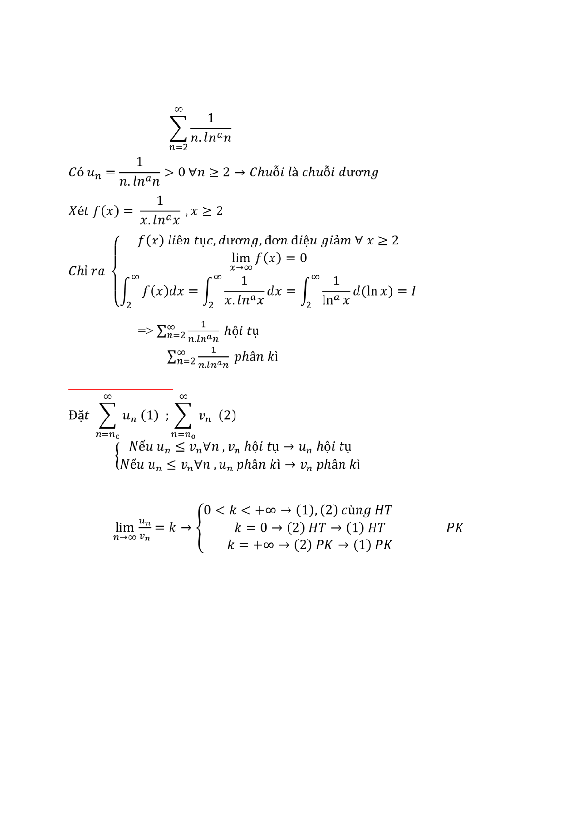 Note: Cách nhớ: chuỗi dài hơn to hơn mà hội tụ thì chuỗi nhỏ hơn cũng phải hội tụ. Chuỗi bé hơn nhỏ hơn mà phân kì thì chuỗi lớn hơn