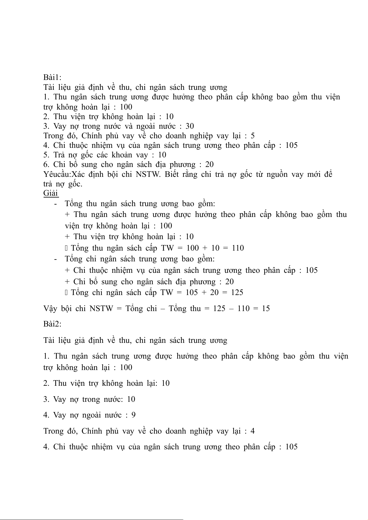 Vậy bội chi NSTW = Tổng chi – Tổng thu = 125 – 110 = 15 Bài 2: