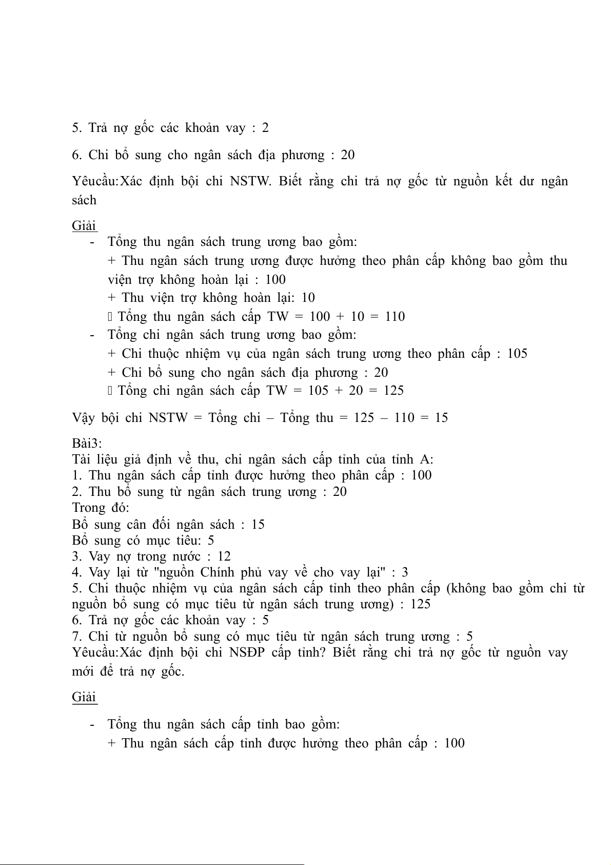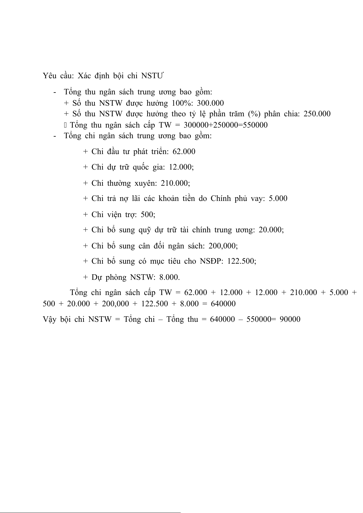 Vậy bội chi NSTW = Tổng chi – Tổng thu = 125 – 110 = 15 Bài 3:
