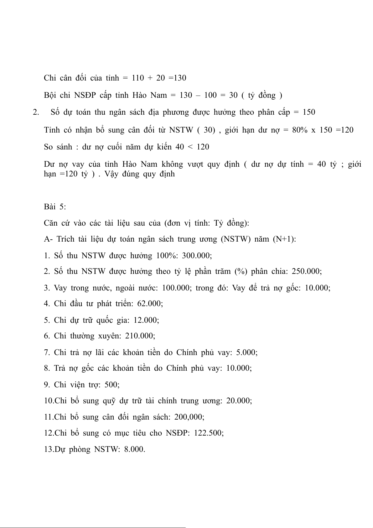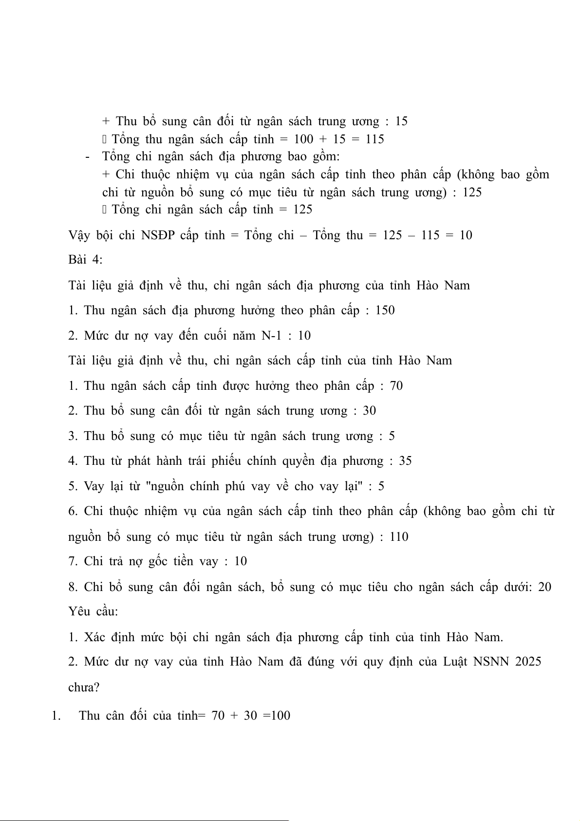 Vậy bội chi NSĐP cấp tỉnh = Tổng chi – Tổng thu = 125 – 115 = 10 Bài 4: