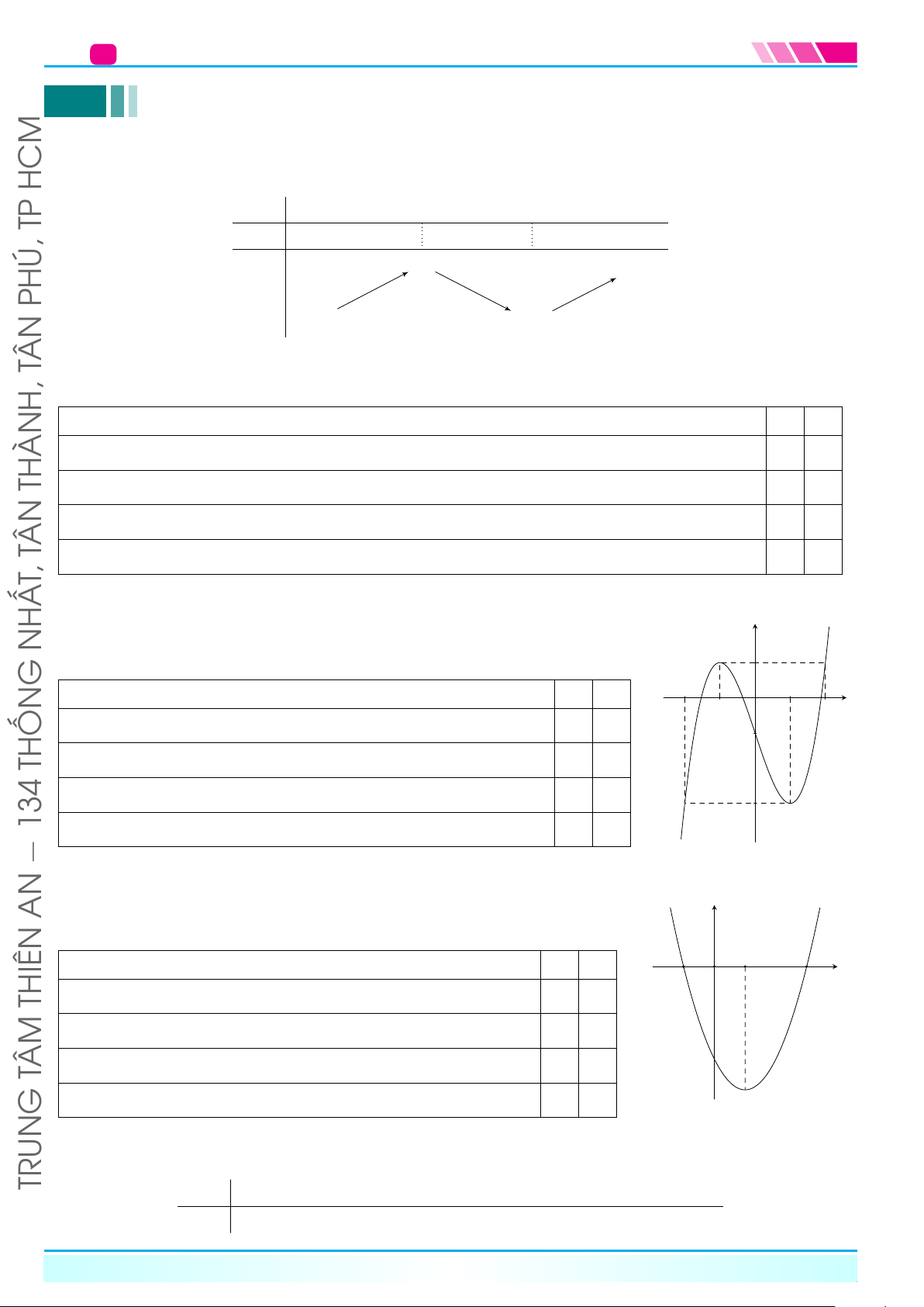 THIÊNBài 7. Cho hàm số y = f(x) có bảng biến thiên như hình vẽ dưới đây. Tìm khoảng đồng biến, nghịch biến của hàm số. TÂM x −∞ 0 1 +∞ y0 NGUYỄN − + 0 − G +∞ 2 UN y TR −1 −∞ −∞ Bài 8. ThS: