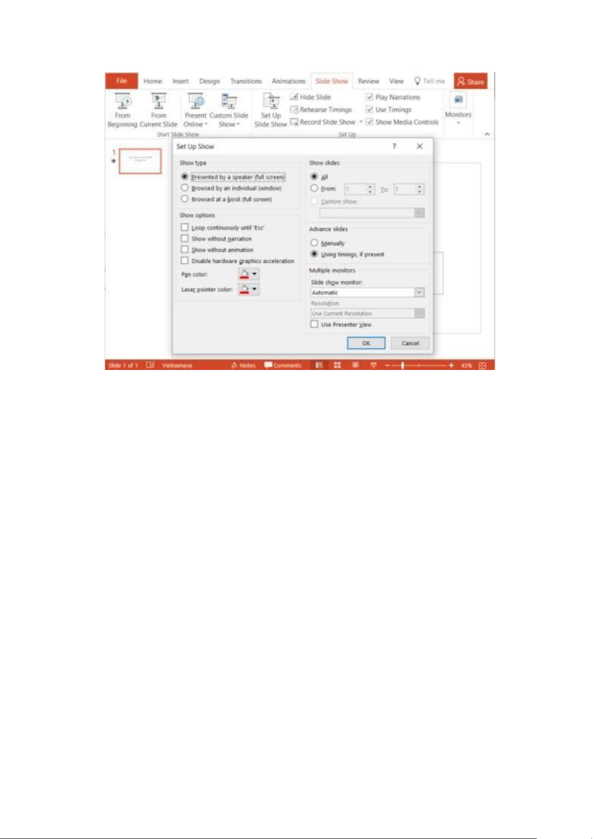 Hộp thoại “Setup Slide Show” xuất hiện, chúng ta sẽ tìm hiểu một số chức năng trong hộp thoại này.