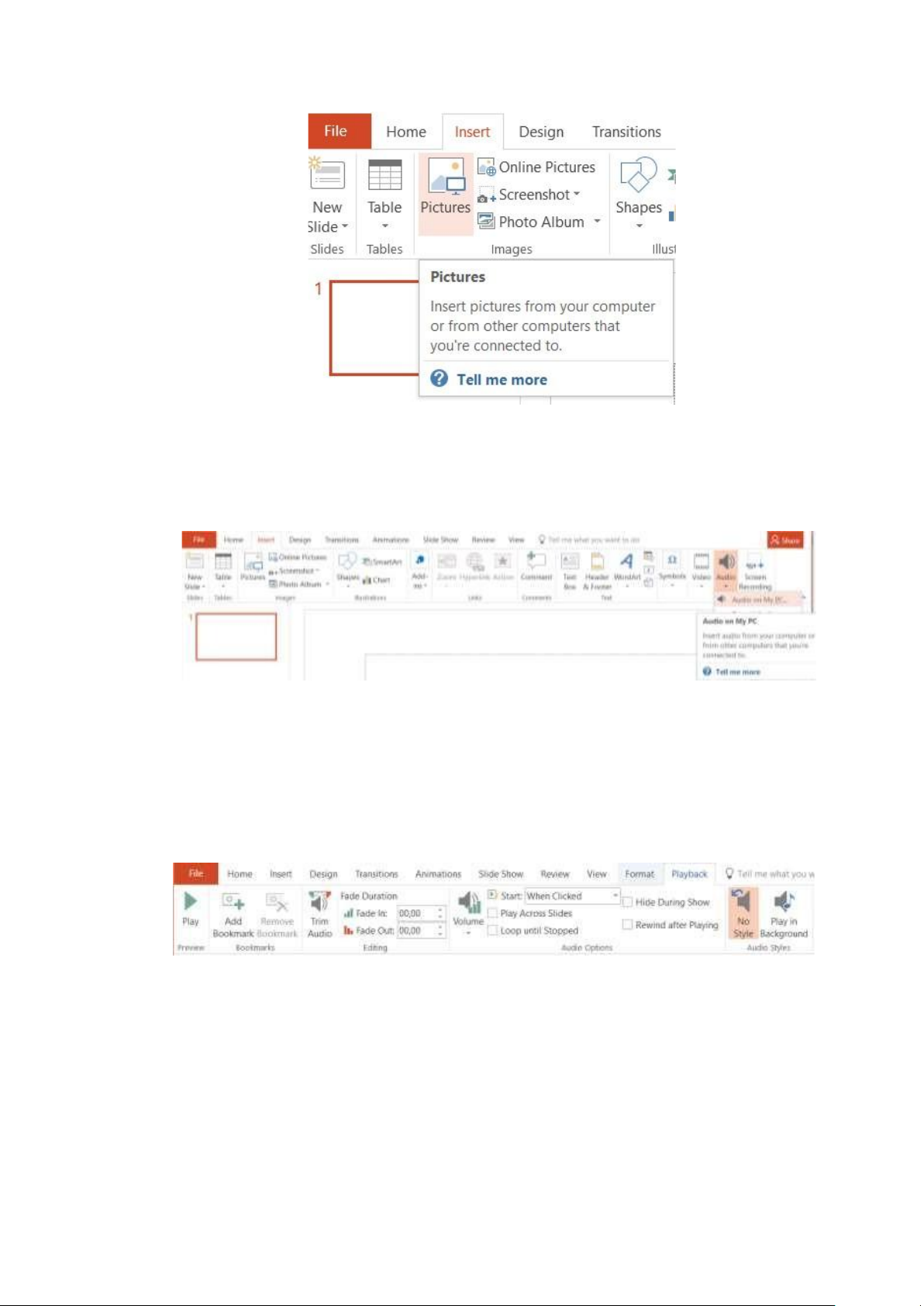 - Chèn âm thanh: Tại Tab INSERT / bấm vào nút Audio / chọn “Audio on My