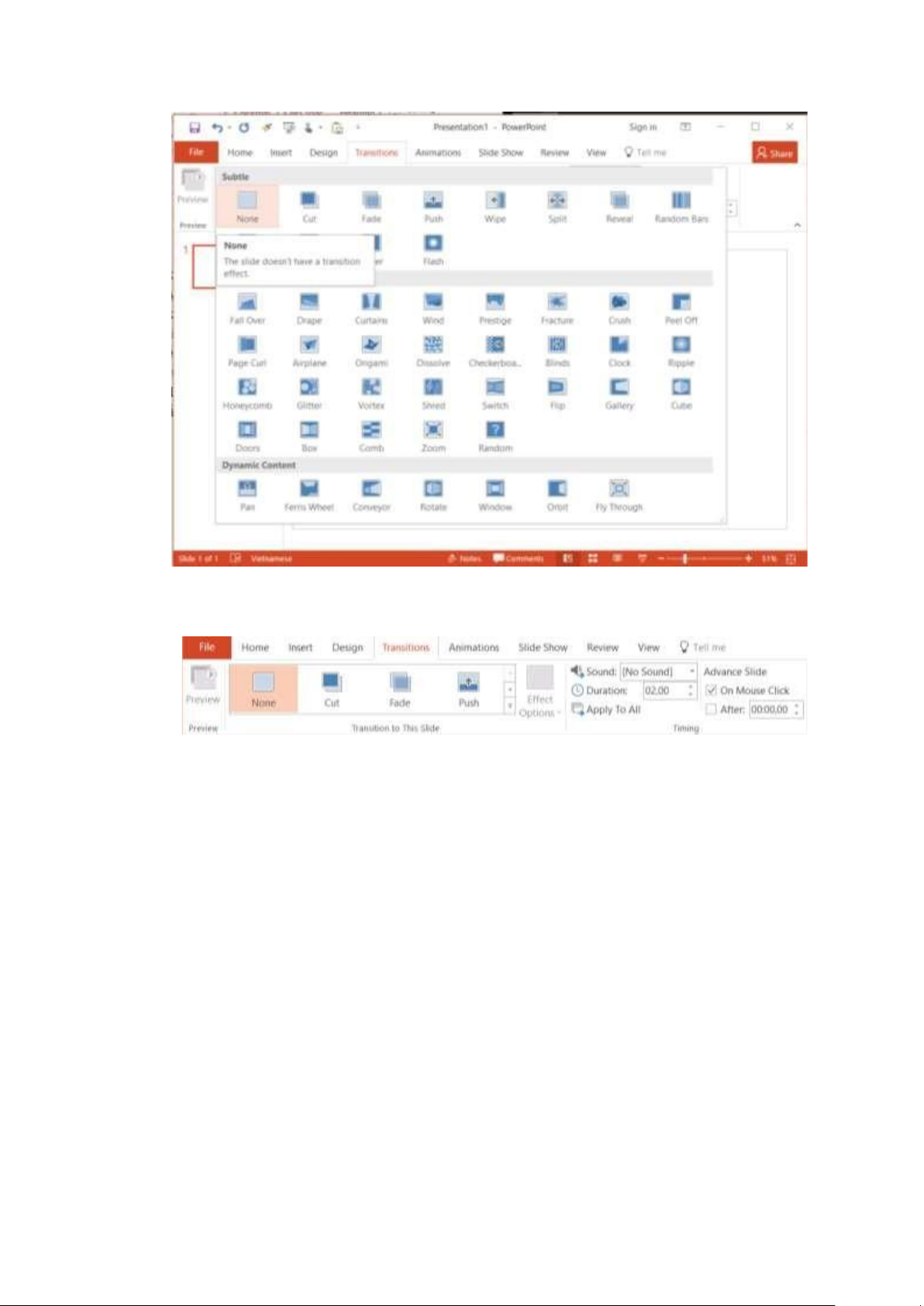 Trên thanh công cụ Ribon / chọn Tab TRANSITIONS / tại ây sẽ thoải mái chọn