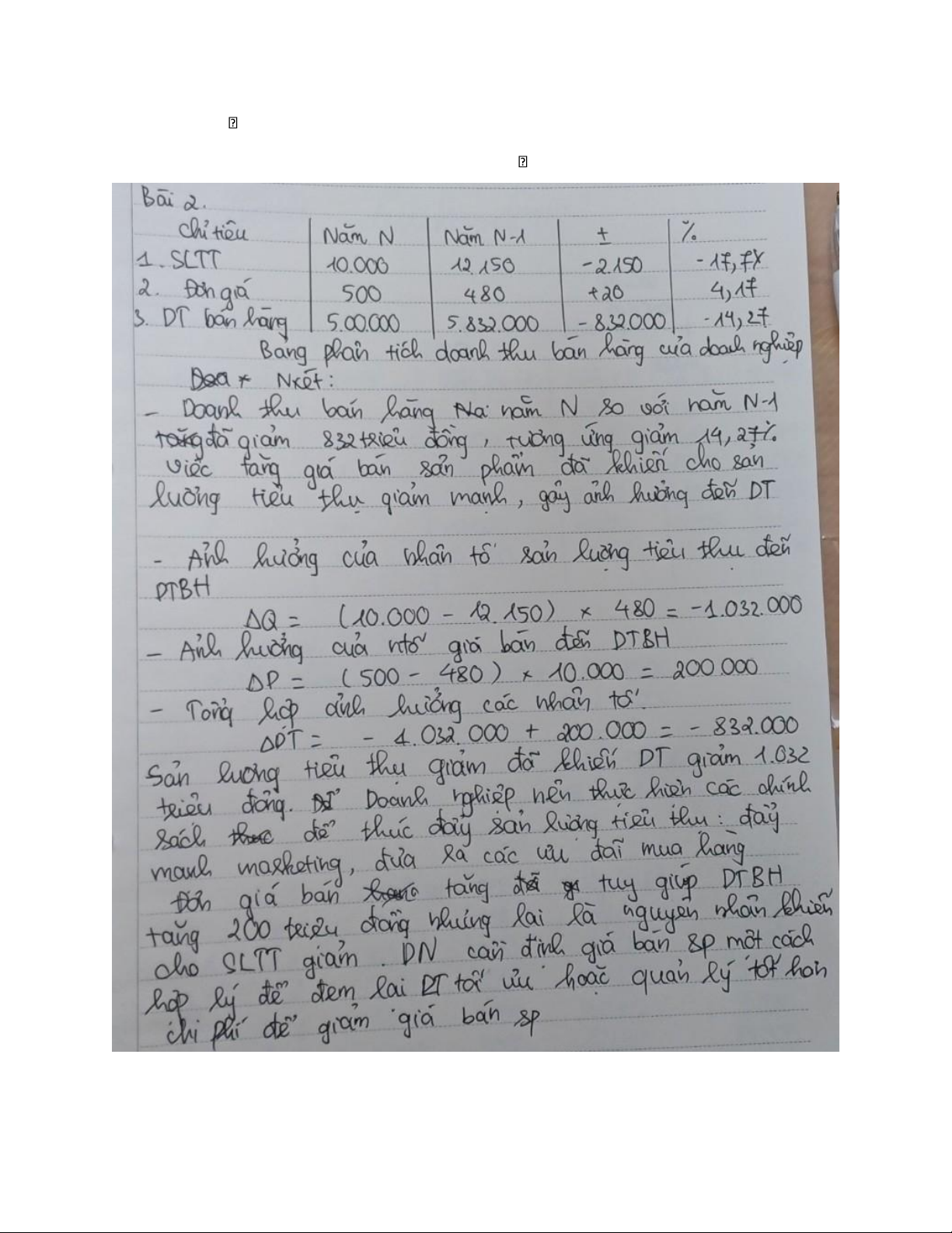 Minh. Căn cứ vào các chỉ tiêu tài chính như sau: Chỉ tiêu Năm 2022 Năm 2023 lOMoAR cPSD| 58675420 1. Doanh thu bán 10,000 15,000 hàng (tỷ đồng) 2. Lợi nhuận sau 2,000 2,500 thuế 3. Vốn kinh doanh 5,000 6,000 của DN Giải: Chỉ tiêu Năm 2022 Năm 2023 Chênh Lệch +- % 1. Doanh 10,000 15,000 5,000 50 thu bán hàng (tỷ đồng)