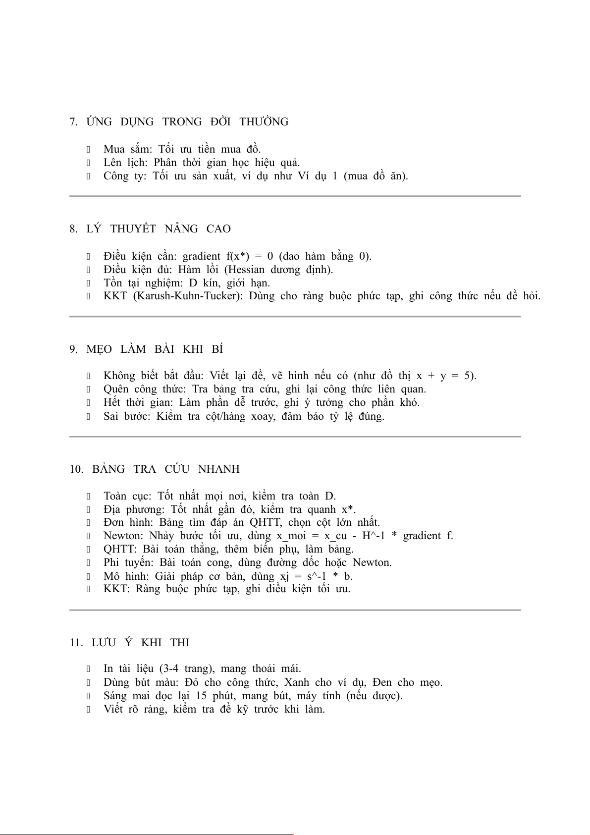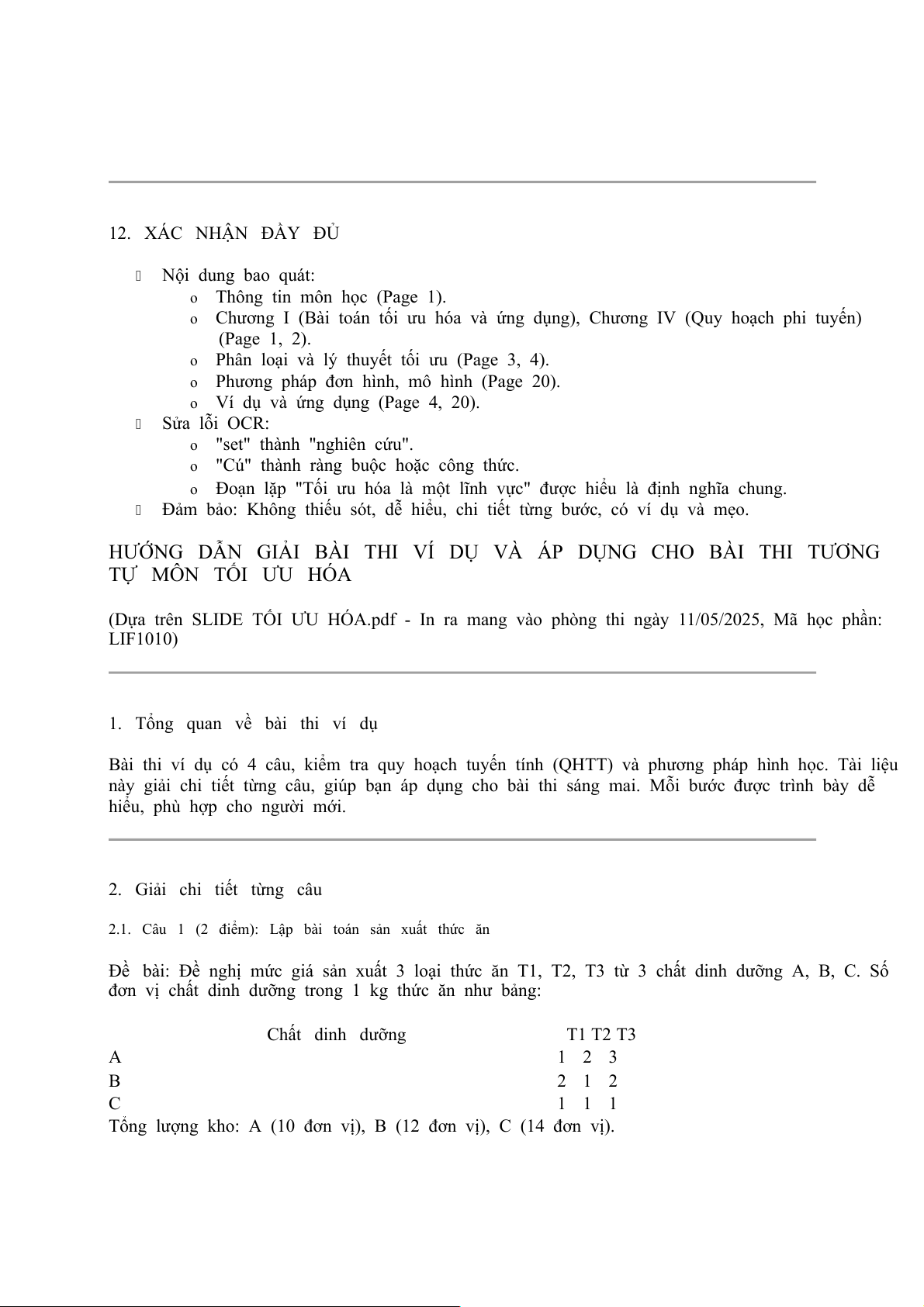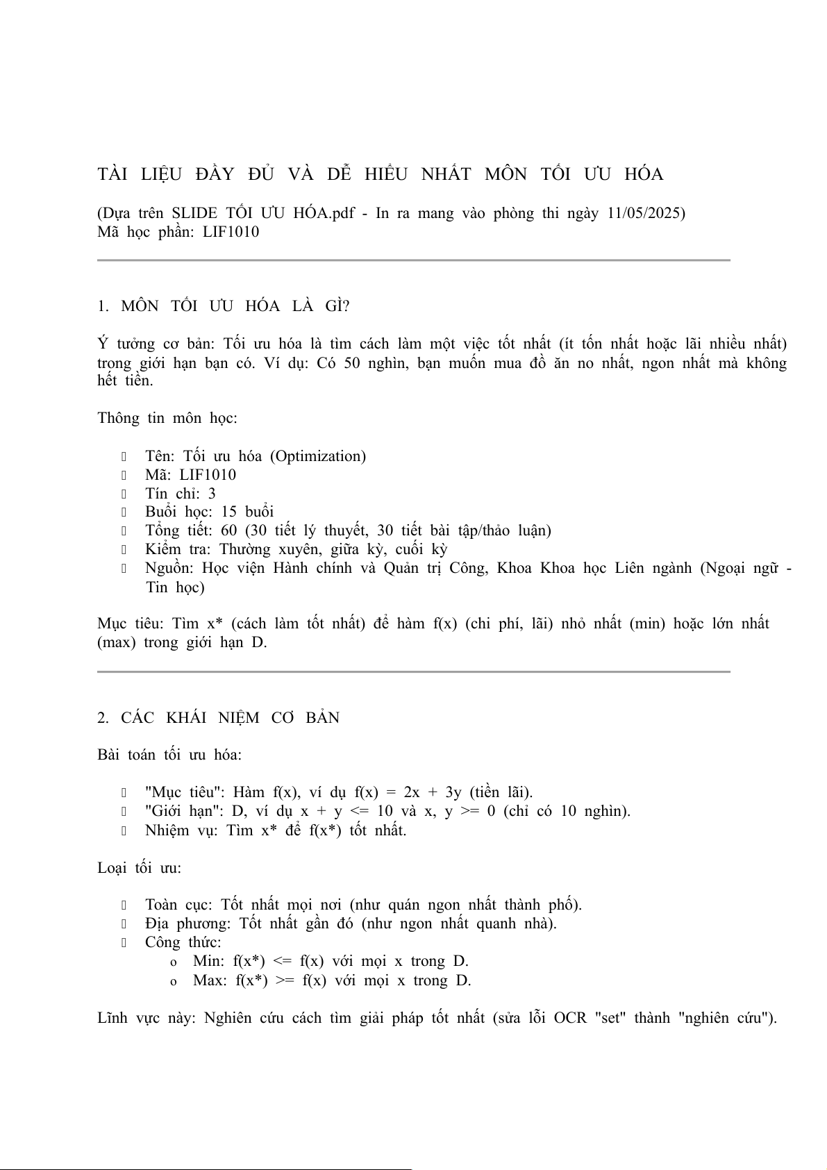 (Dựa trên SLIDE TỐI ƯU HÓA.pdf - In ra mang vào phòng thi ngày 11/05/2025) Mã học phần: LIF1010