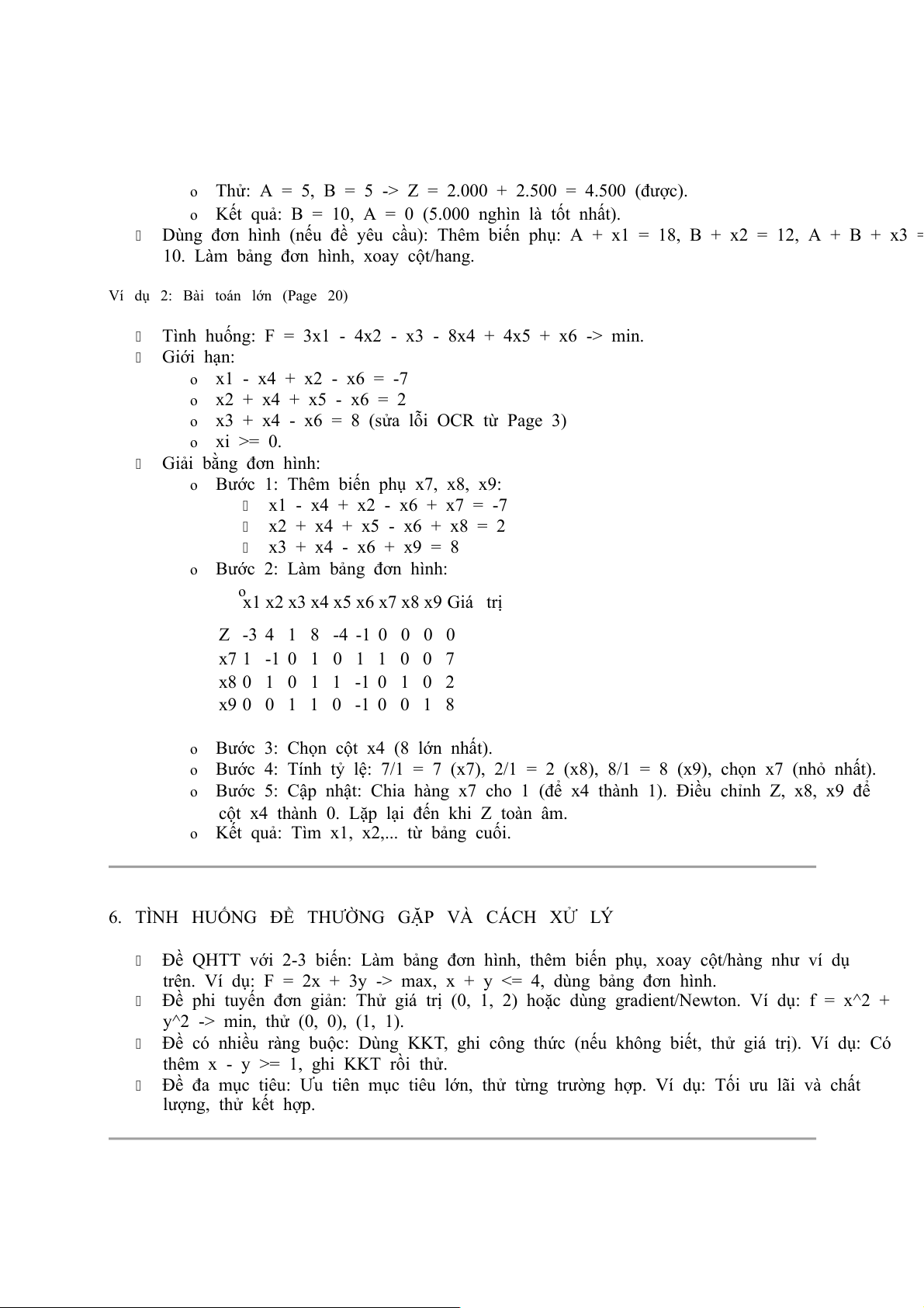 x3 + x4 - x6 = 8 (sửa lỗi OCR từ Page 3) o xi >= 0. Giải bằng đơn hình: o