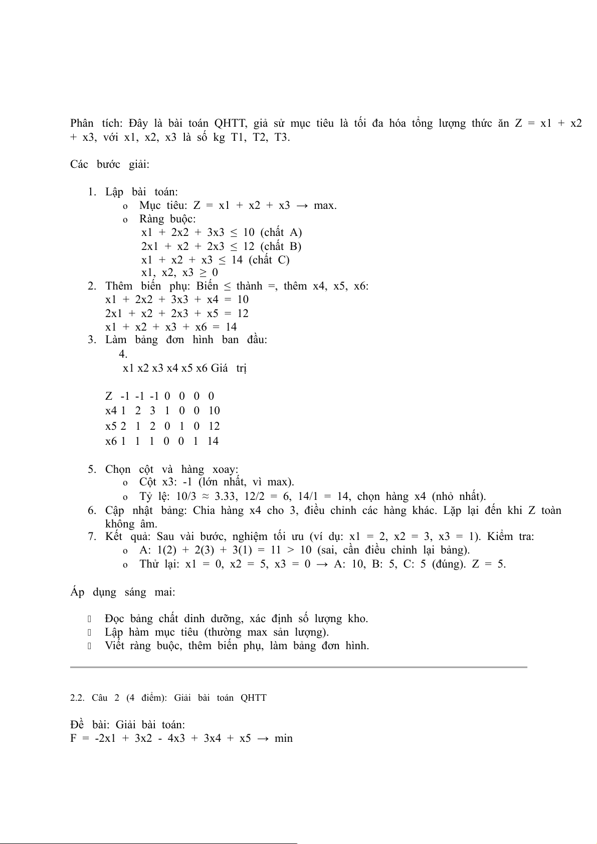 Phân tích: Tối thiểu hóa F, chuyển ≥ thành ≤, thêm biến phụ, dùng đơn hình.