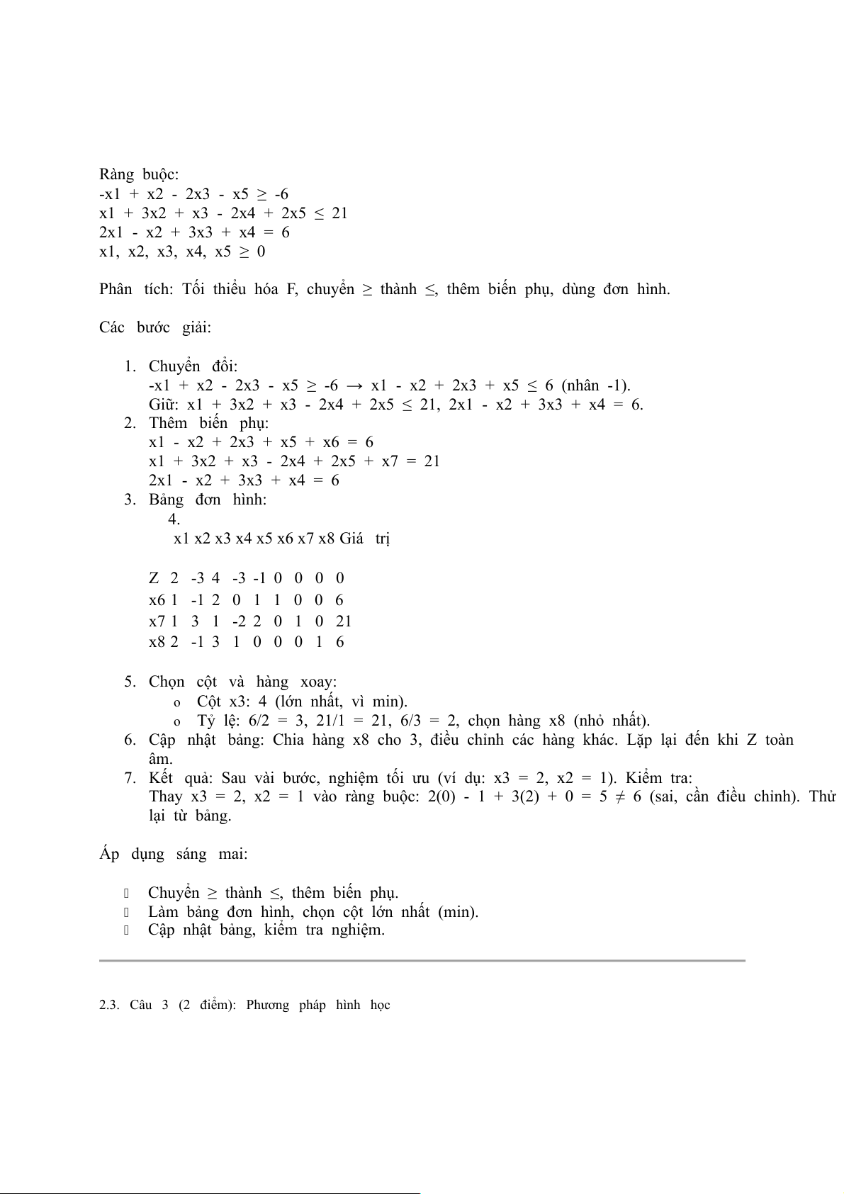 7. Kết quả: Sau vài bước, nghiệm tối ưu (ví dụ: x1 = 2, x2 = 3, x3 = 1). Kiểm tra: o
