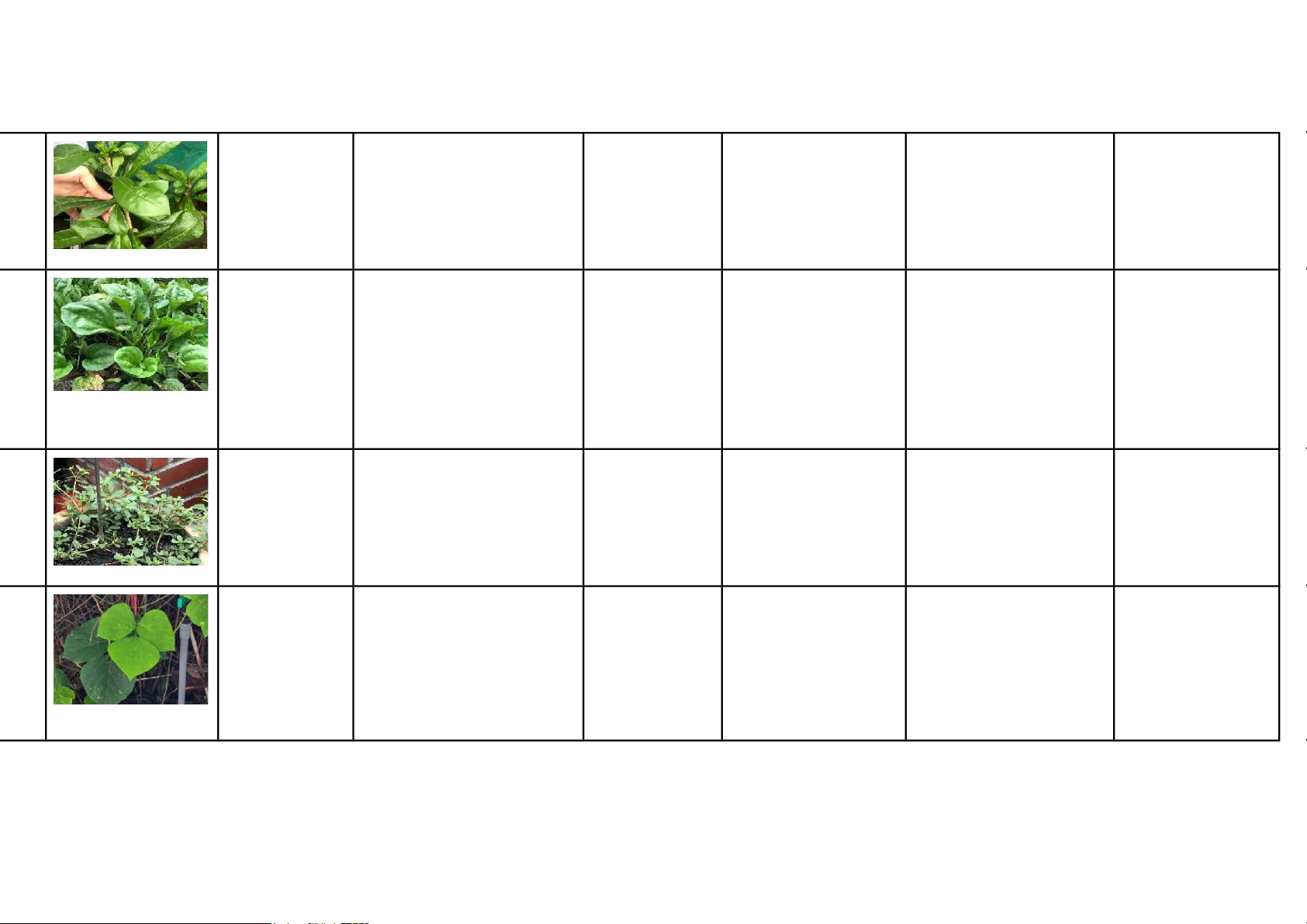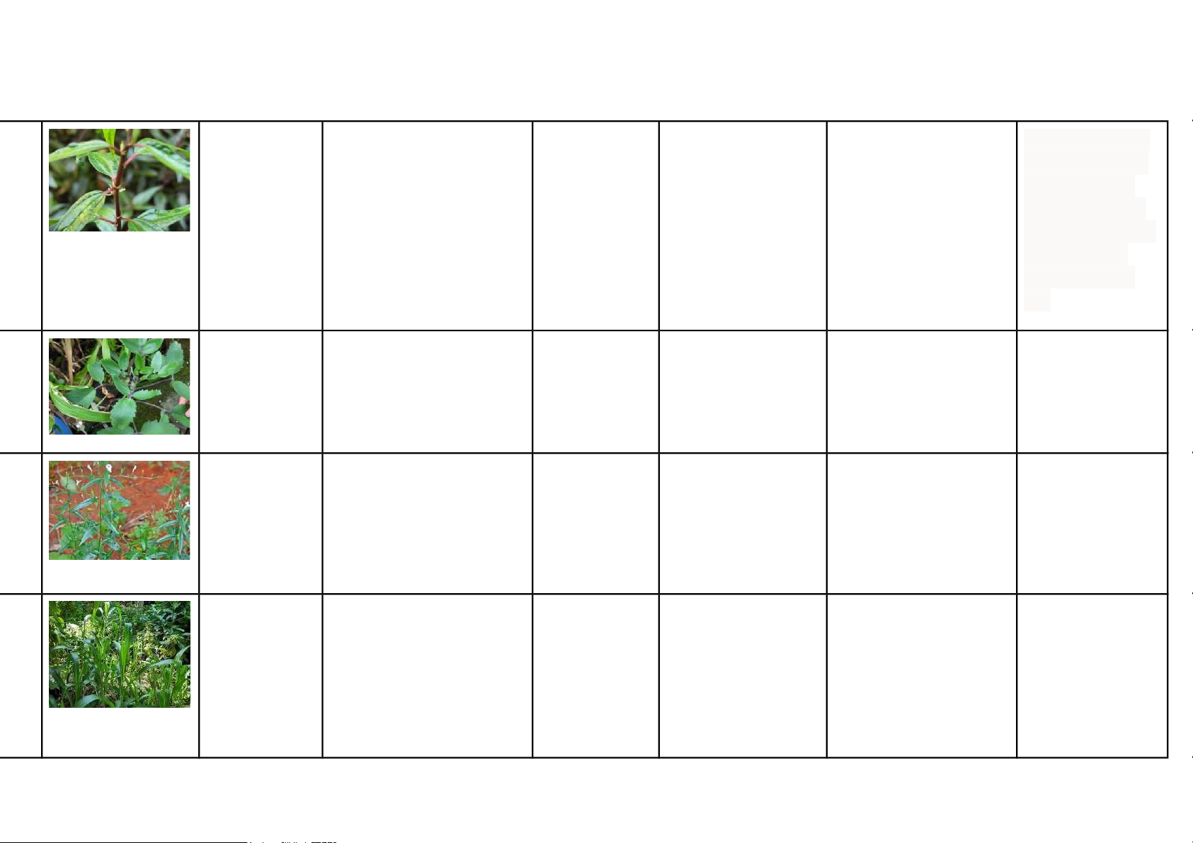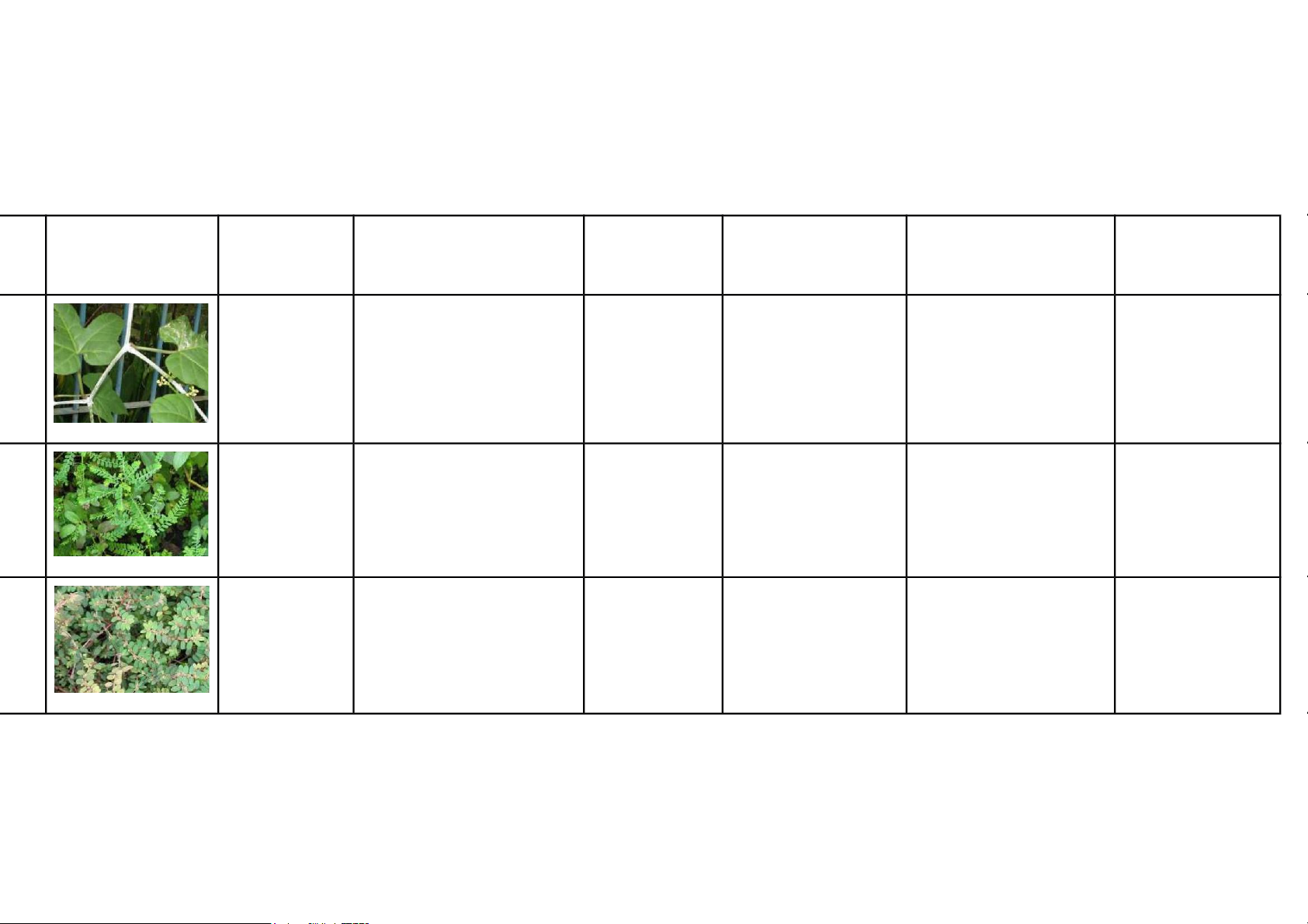 Lợi tiểu, lợi sữa, làm Nhìn giống cây coixenolid thuốc bổ, trợ tiêu hóa Bắp, lá mọc Poaceae cách, đầu thuôn nhọn, gân lá song song rõ ở mặt dưới lOMoAR cPSD| 45469857 20 Cỏ xước Achyranthes aspera Rễ Saponin, Trị thấp khớp, đau Lá gợn sóng, lưng, nhức xương, hình trứng Amaranthaceae Alkaloid cao huyết áp ngược, nách lá ( achyranthin ) có 2 lá nhỏ hơn; Thân non phù ở lóng, thân già có nốt sần 21 Bồ kết Gleditsia fera Quả, gai, hạt Flavonoid, Quả trị ho, sâu răng; Lá kép lông chim 2 lần, có Fabaceae saponin triterpen