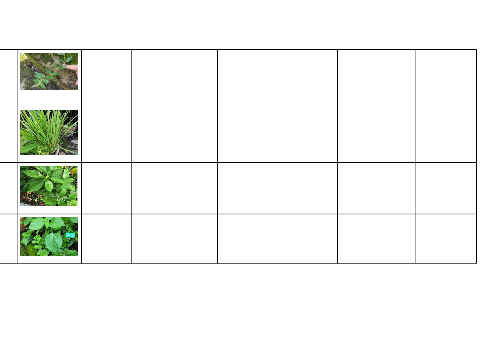 NHẬN THỨC DƯỢC LIỆU 101 CÂY THUỐC BUỔI 5 ST Hình ảnh Tên VN Tên khoa học Bộ phận Thành phần hóa Công dụng Ghi chú T dùng học 1 Chìa vôi Cissus modeccoides Dây, rễ củ Chất nhầy, chất Trị nhức xương, nhức Toàn thân phủ đắng, flavonoid, lưng, bỏng, trĩ phấn trắng, có Vitaceae saponin tua cuốn 2 Chó đẻ thân Phyllanthus amarus Cây trừ rễ Alkaloid, lignan Trị bệnh gan, phù Có quả dưới lá, xanh thũng, trẻ em cam lá đơn, mọc so le Phyllanthaceae tích 3 Cỏ sữa lá Euphorbia thymifolia Cây trừ rễ Flavonoid, Trị lỵ trực trùng, Lá mọc nghiêng nhỏ terpenoid viêm ruột, tiêu chảy, về một phía, có Euphorbiaceae lợi sữa mủ trắng, cây rất nhỏ, thân đỏ tía lOMoAR cPSD| 45469857 4 Cỏ sữa lá lớn Euphorbia hirta Toàn cây Flavonoid, Chữa lỵ, viêm ruột, Lá mọc nghiêng triterpen lợi sữa về 1 phía, lá dài Euphorbiaceae hơn, 1 bên phiến lá bị méo ở gần cuống 5 Cỏ tranh Imperata cylindrica Thân rễ Dẫn xuất flavan,