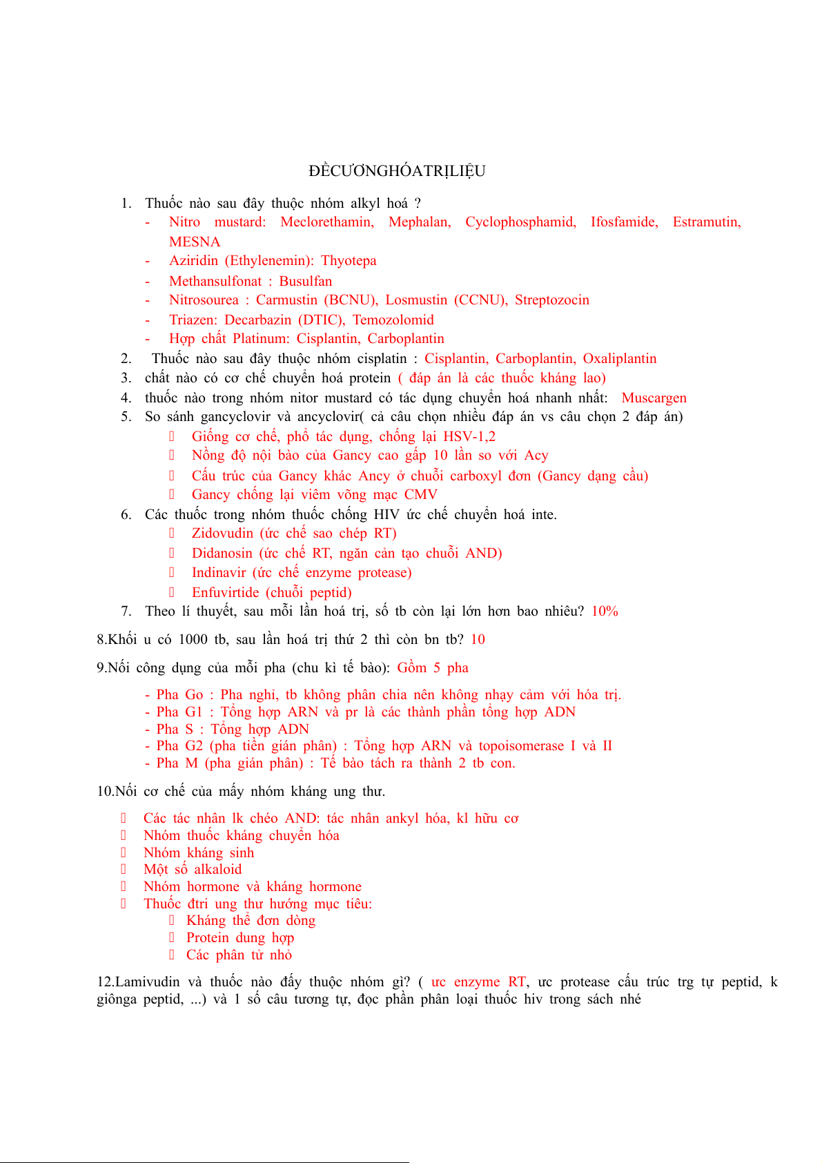 ĐỀ CƯƠNG HÓA TRỊ LIỆU
