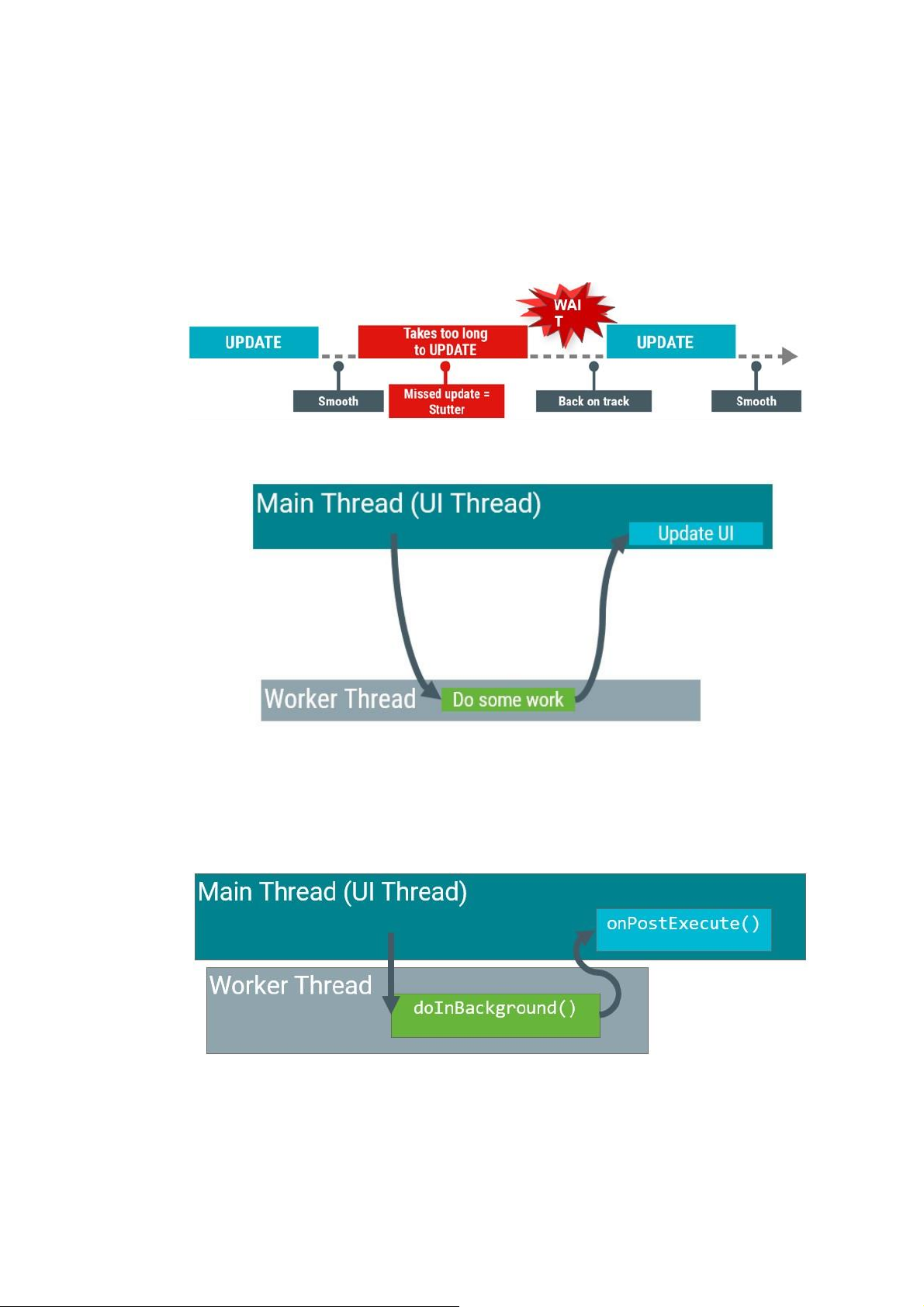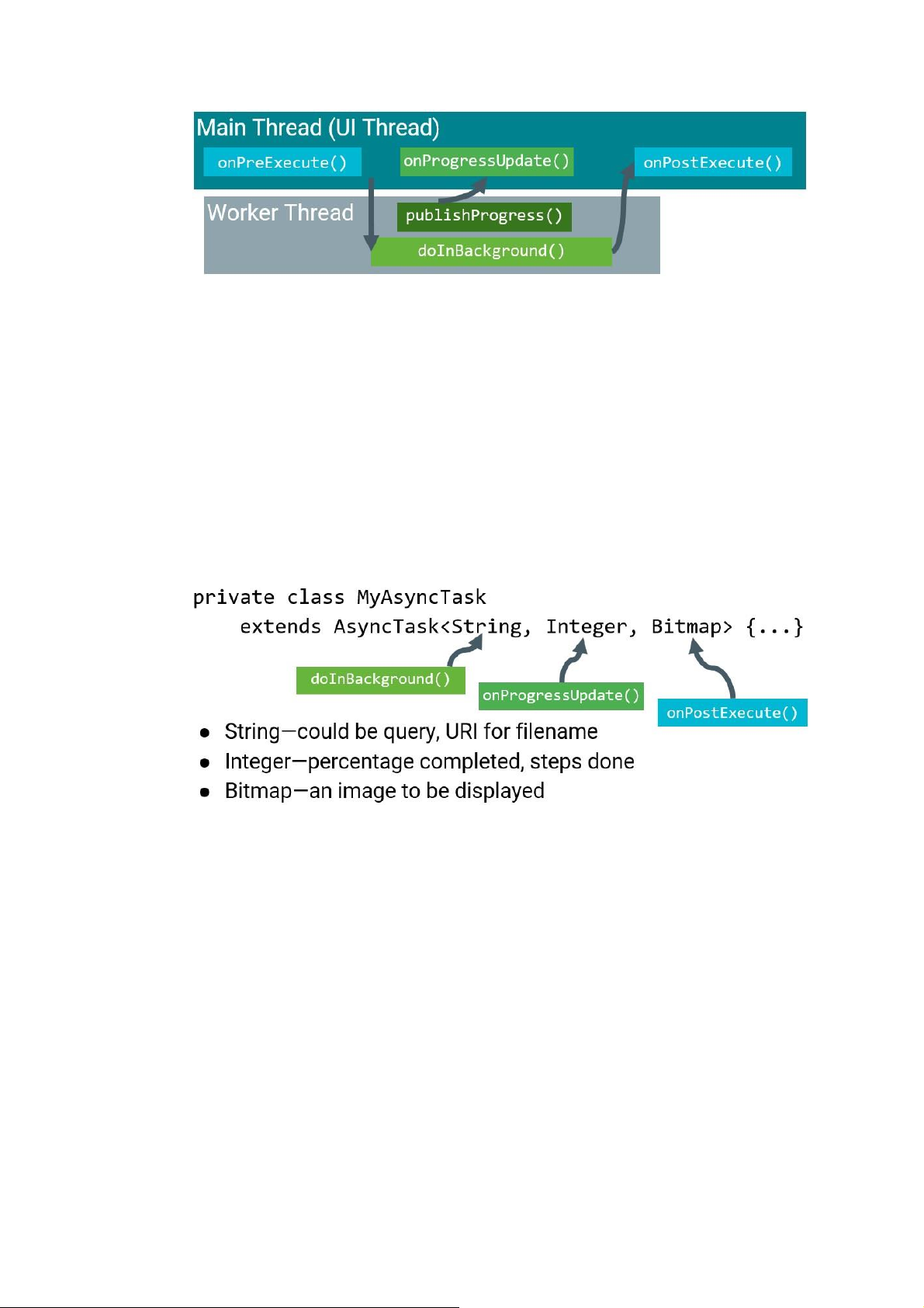 ● onPostExecute()—runs on main thread when work done ○ Process results ○ Publish results to the UI - Helper methods ● onPreExecute() ○ Runs on the main thread ○ Sets up the task ● onProgressUpdate() ○ Runs on the main thread