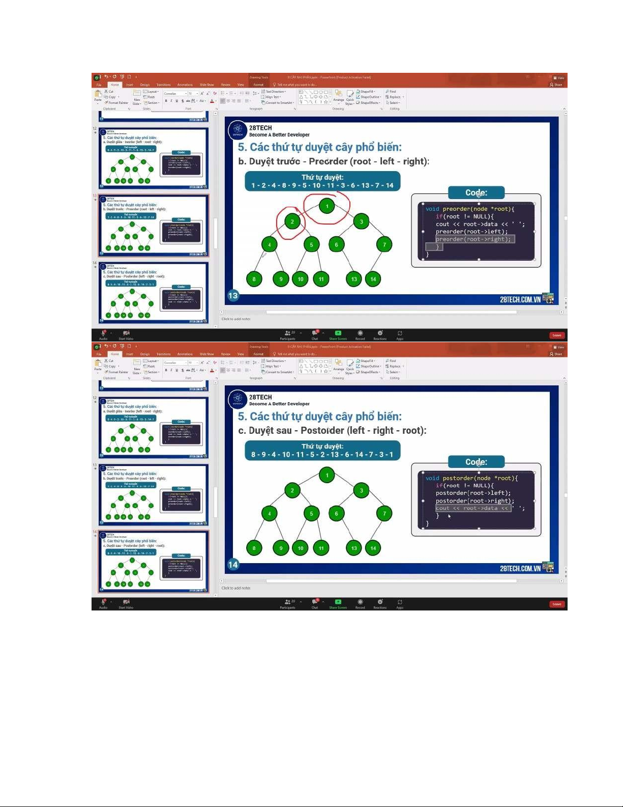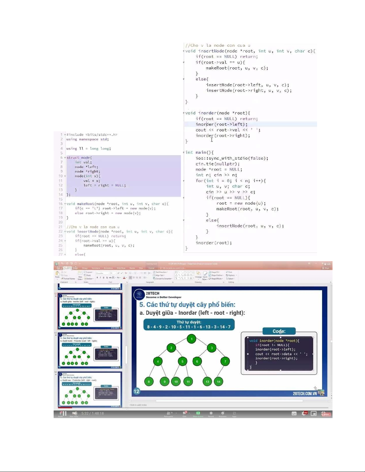 duyettree(T->LP); duyettree(T- >RP); } } // dem so phan tu cua cay int demtree(tr T){ int dem = 0; while(T != NULL){ ++dem; demtree(T->LP); ++dem; demtree(T->RP); } return dem; }