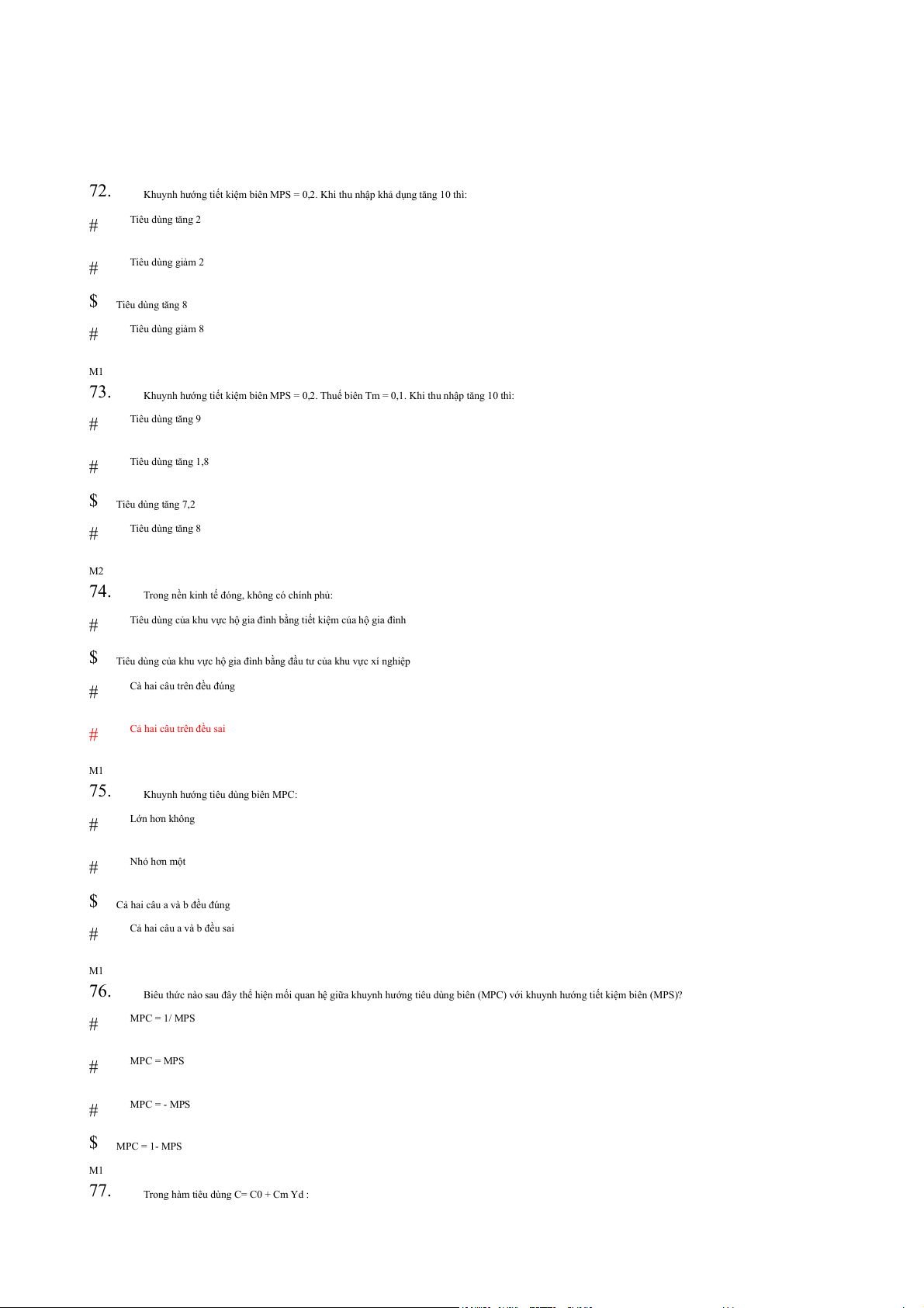 Khuynh hướng tiết kiệm biên MPS = 0,2. Khi thu nhập khả dụng tăng 10 thì: # Tiêu dùng tăng 2 # Tiêu dùng giảm 2 $ Tiêu dùng tăng 8 # Tiêu dùng giảm 8 M1 73.