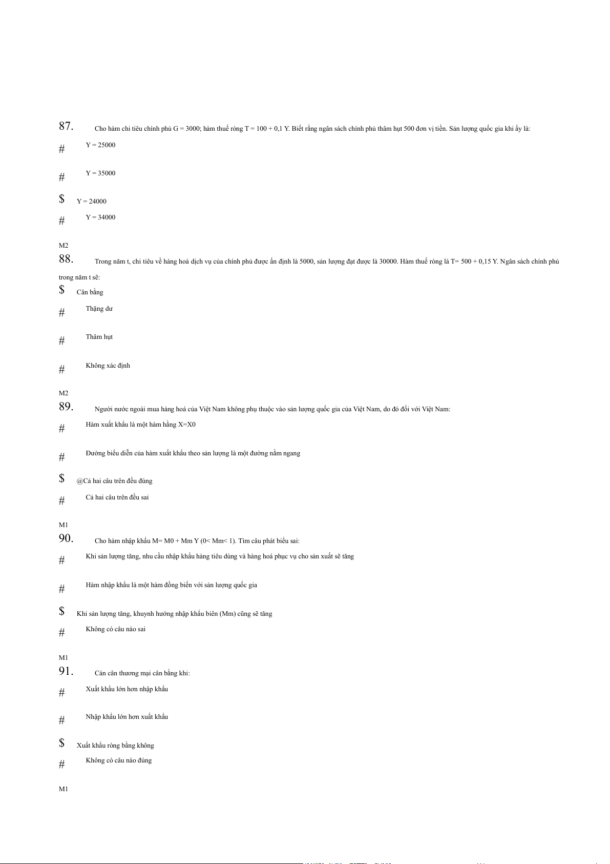 Nếu xuất khẩu là một hàm hằng, nhập khẩu là hàm đồng biến với sản lượng; khi sản lượng càng tăng thì cán cân ngoại thương có xu hướng # Cân bằng $ Thâm hụt # Thặng dư # Không xác định được M1 93.