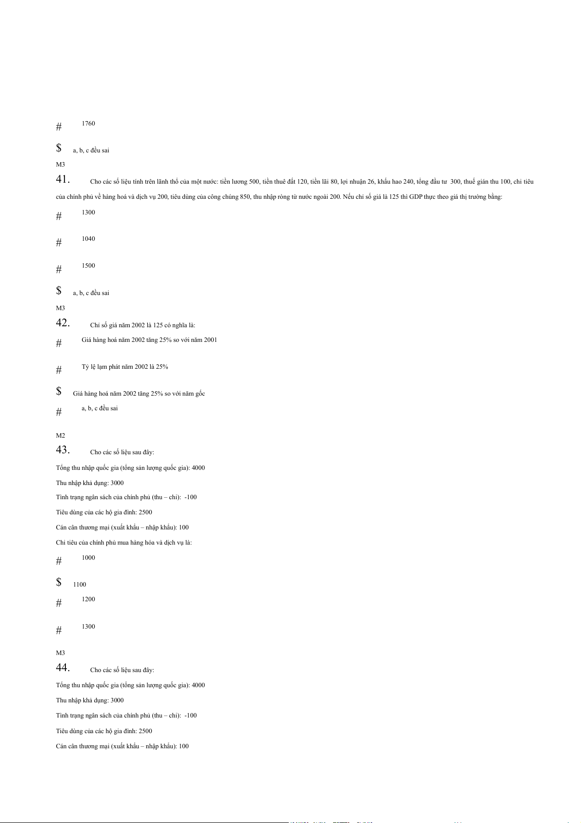 Nếu hàm tiêu dùng có dạng C = 1000+ 0,75 Yd , thì hàm tiết kiệm có dạng: # S = 1000 + 0,25 Yd $ S = -1000 + 0,25 Yd # S = -1000 + 0,75 Yd # Không có câu nào đúng M1 72.