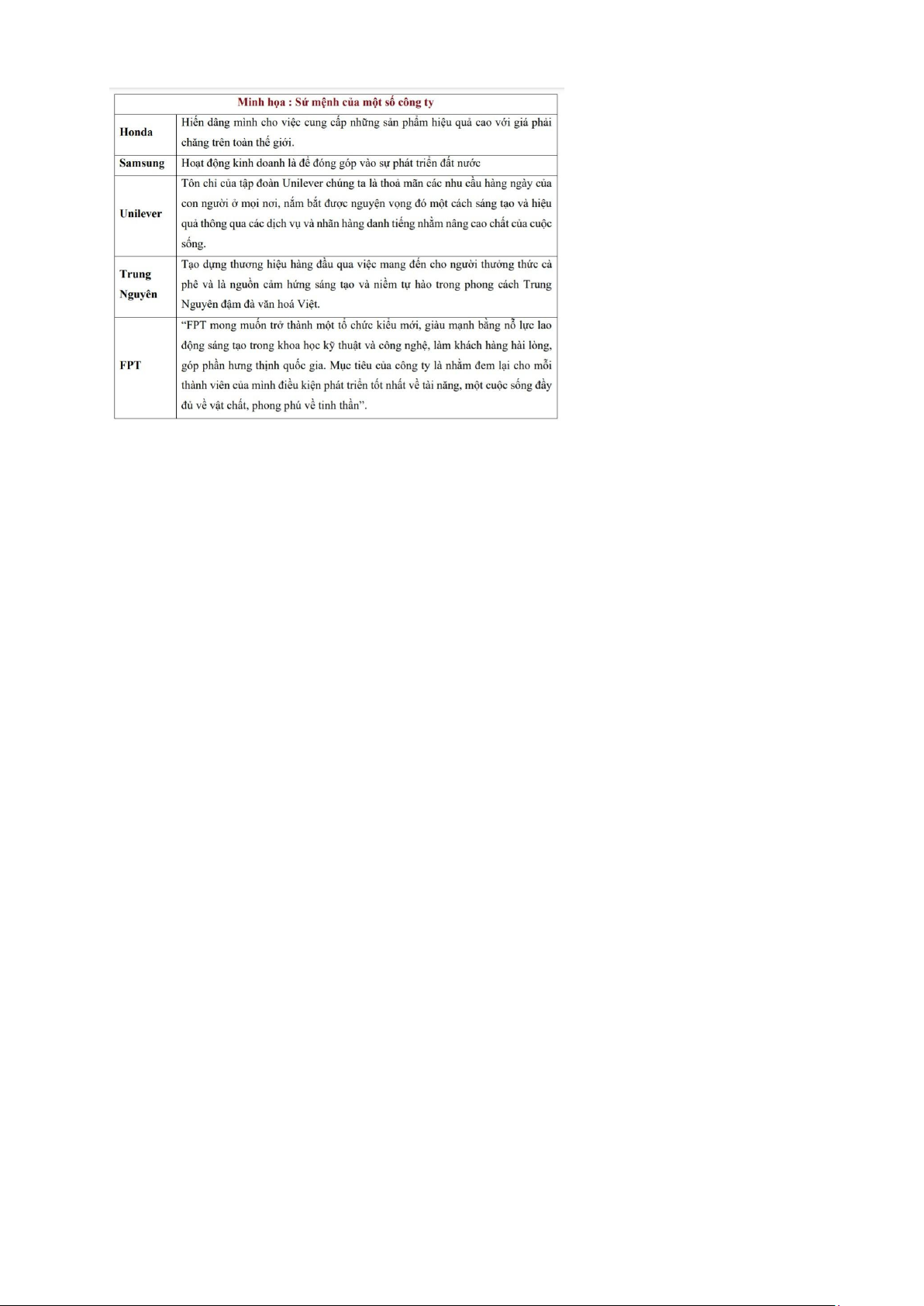 • Bản tuyên bố nhiệm vụ của DN