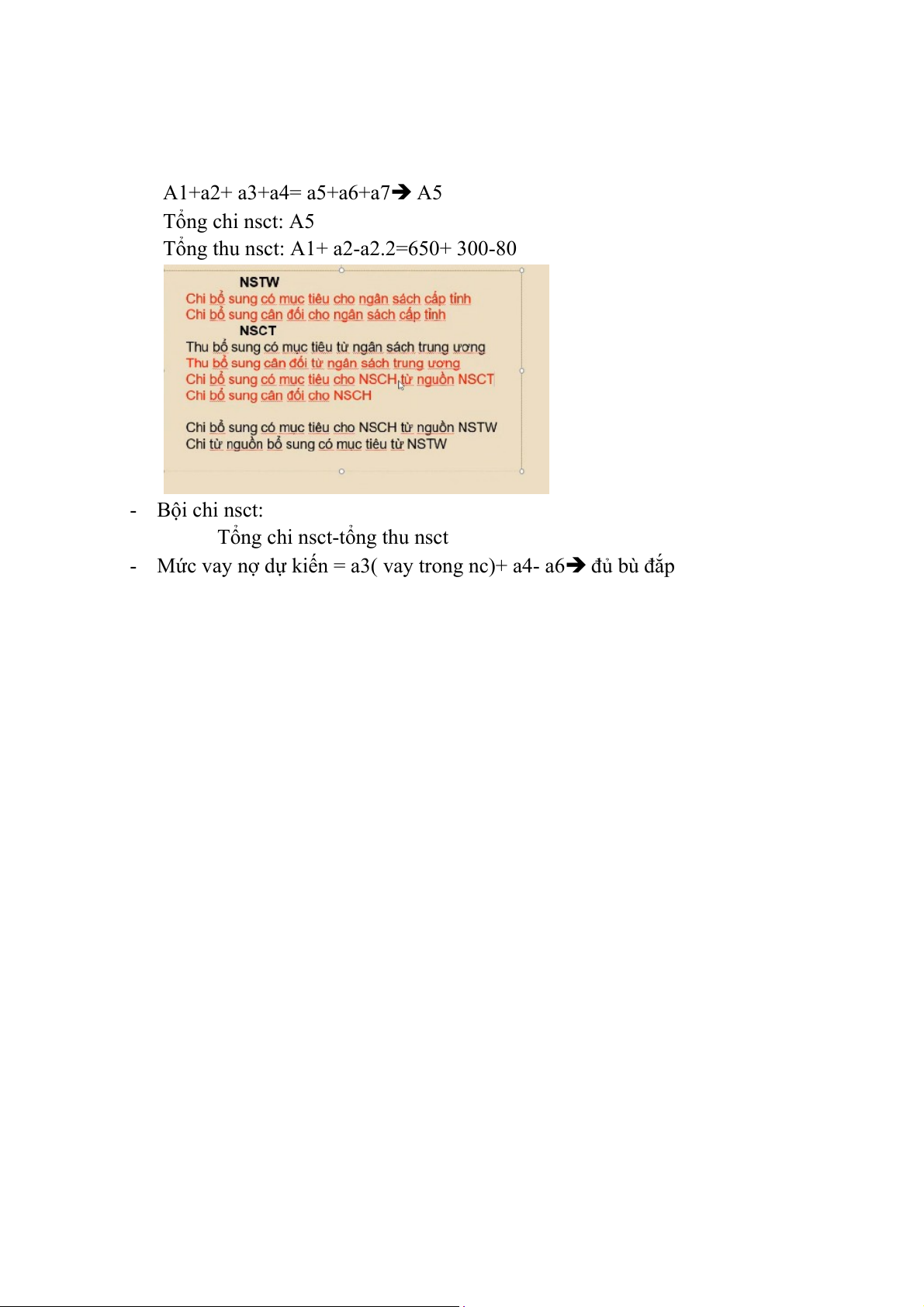 - Bội chi nstw= tổng chi nstw- tổng thu nstw - Tổng chi nstw= A3+ A5 - Tổng thu nstw= A1