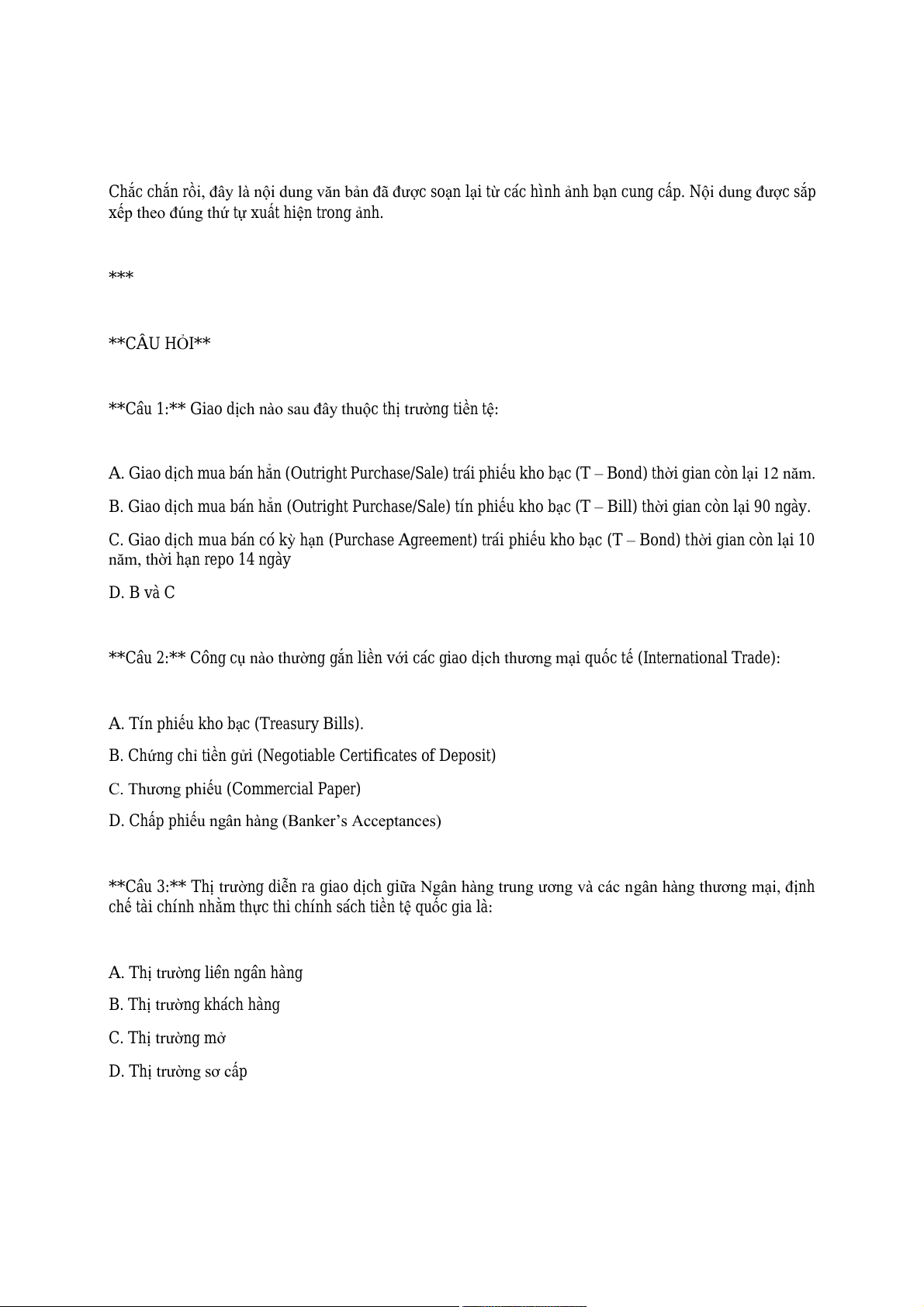 **Câu 3:** Thị trường diễn ra giao dịch giữa Ngân hàng trung ương và các ngân hàng thương mại, định