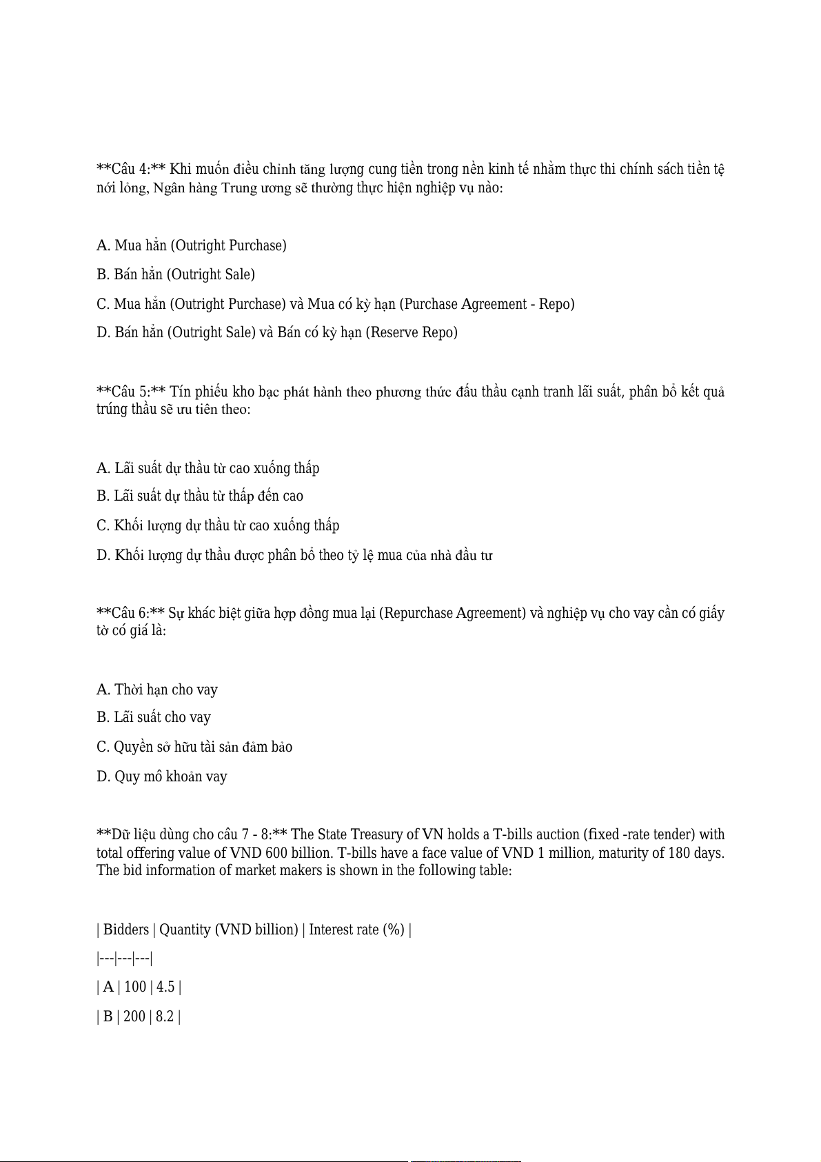 **Câu 5:** Tín phiếu kho bạc phát hành theo phương thức đấu thầu cạnh tranh lãi suất, phân bổ kết quả