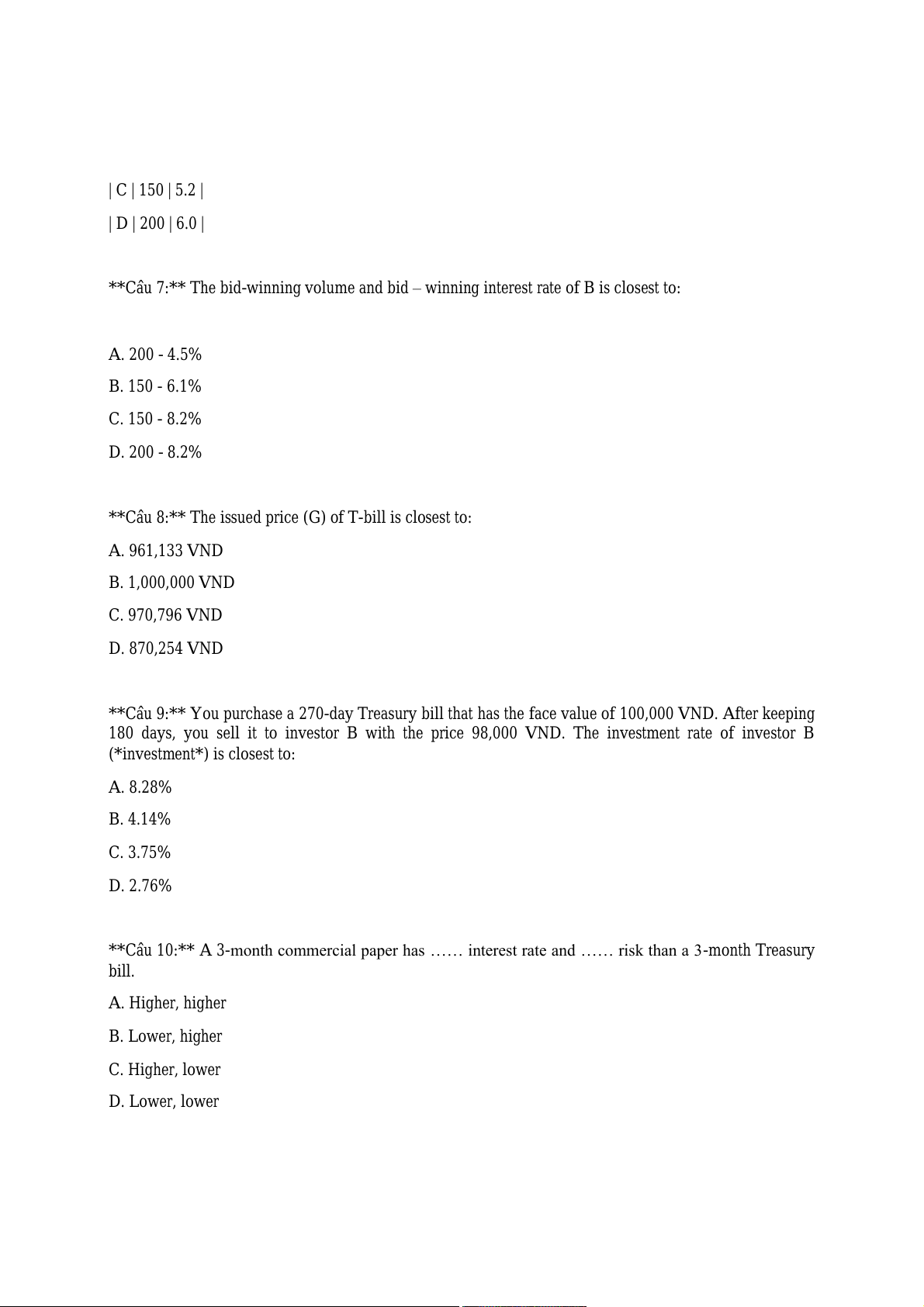 **Câu 9:** You purchase a 270-day Treasury bil that has the face value of 100,000 VND. After keeping