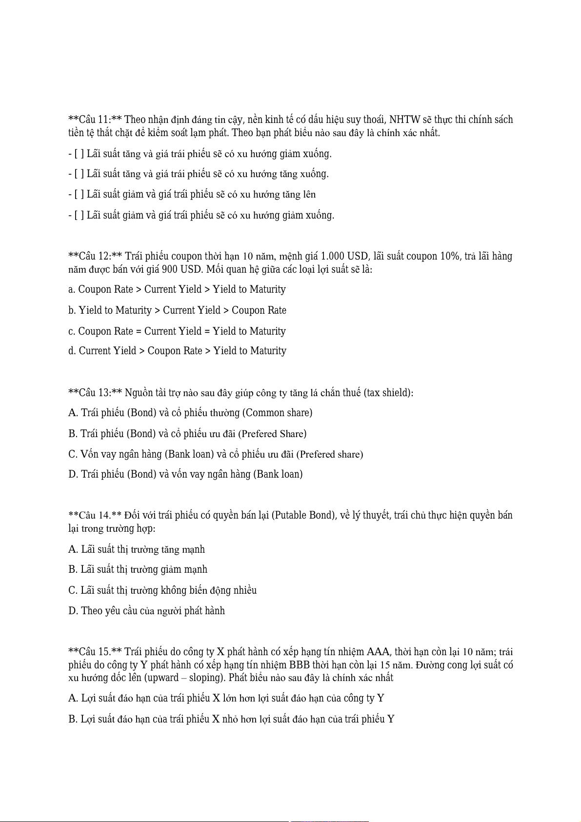 **Câu 12:** Trái phiếu coupon thời hạn 10 năm, mệnh giá 1.000 USD, lãi suất coupon 10%, trả lãi hàng