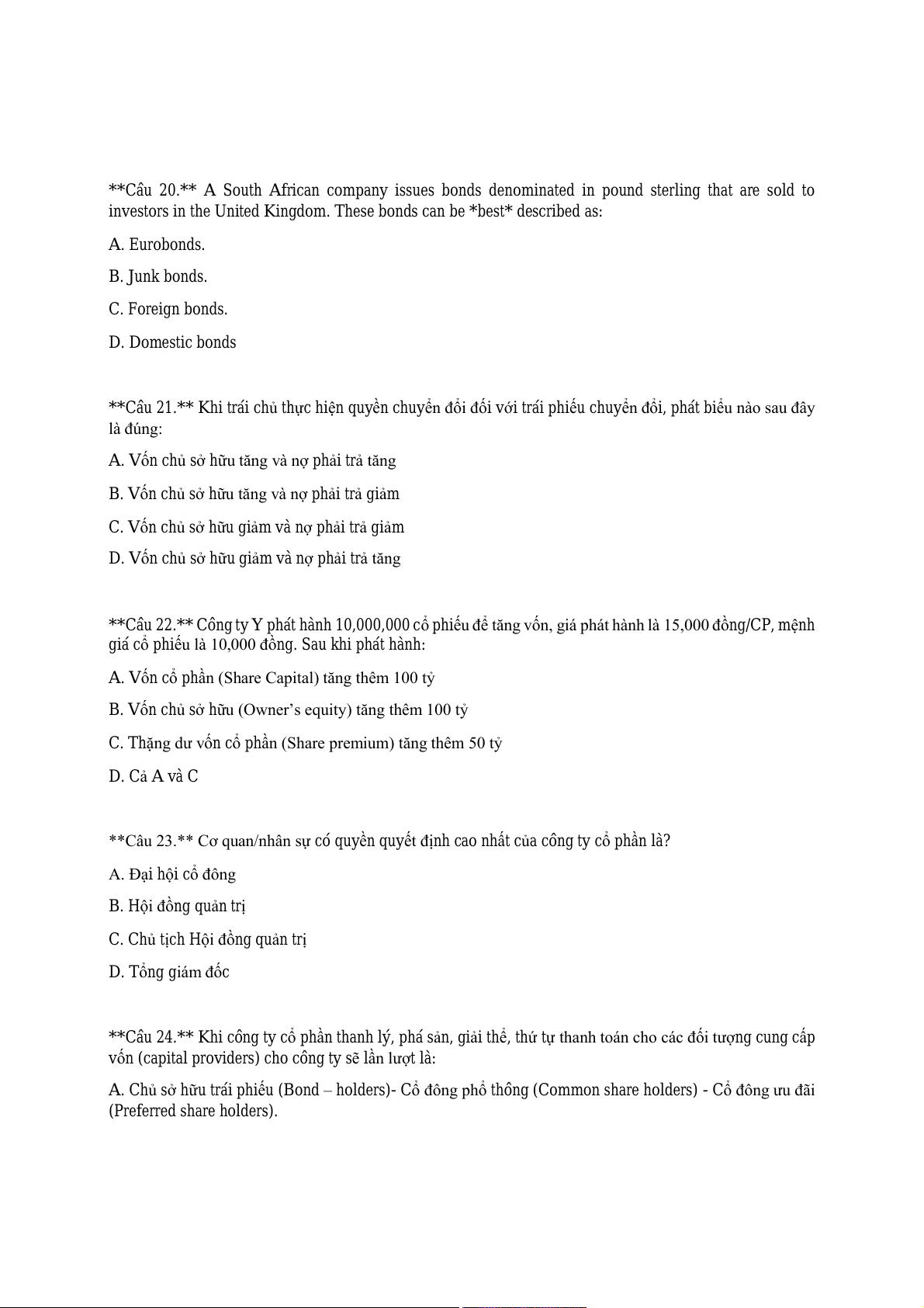 **Câu 19.** Which of the fol owing provisions is a benefit to the issuer? A. Put provision B. Cal provision C. Conversion provision D. Floating rate with Floor